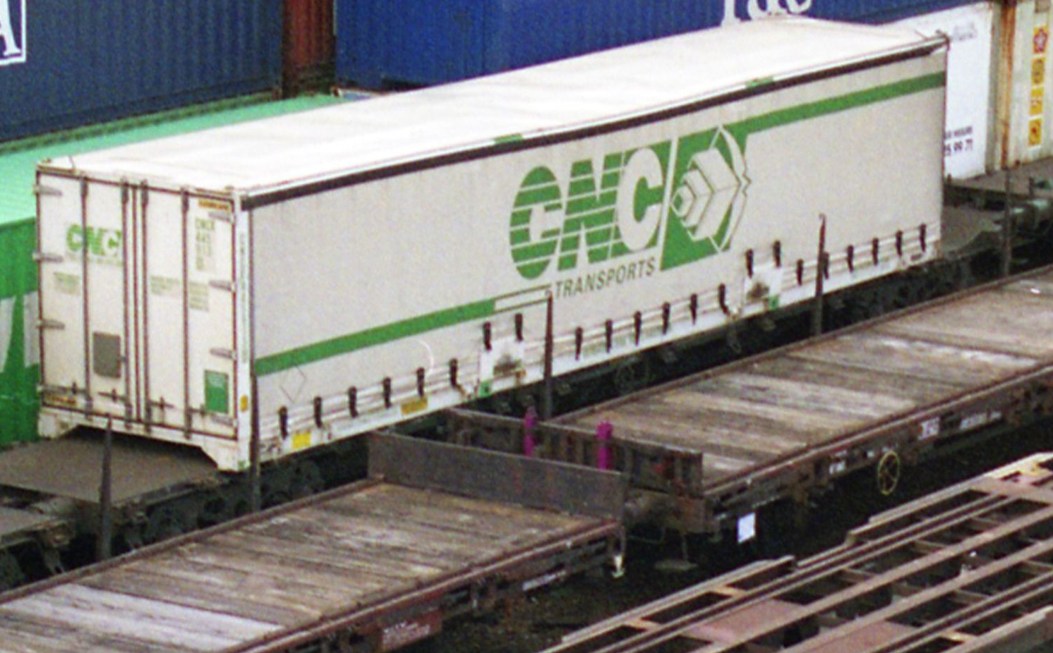 Couleur brune Chargement d'une caisse mobile bâchée "CNC" blanche et verte Attelage court à élongation NEM 355 Rayon de courbure minimal : 192 mm |