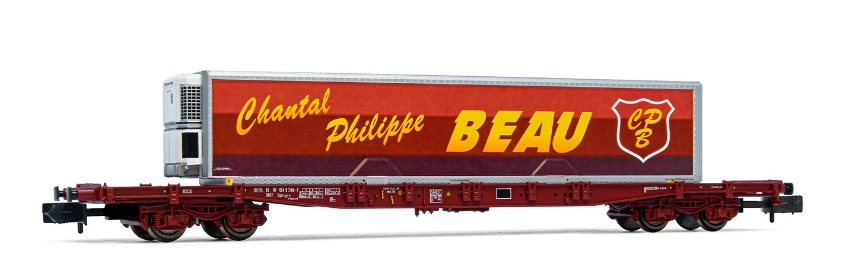 Couleur brune TOUAX Chargement d'un conteneur frigorifique "Chantal Philippe BEAU" Attelage court à élongation NEM 355 Rayon de courbure minimal : 192 mm |