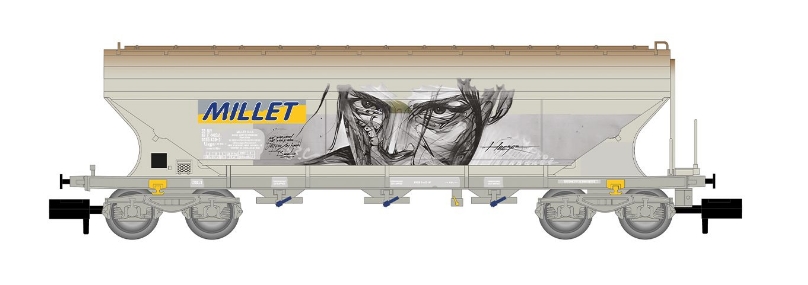 Couleur grise Marquage "MILLET" avec graffitis Attelage court à élongation NEM 355 Rayon de courbure minimal : 192 mm |