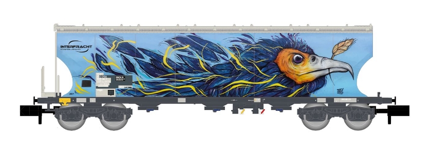 Couleur bleue Décoration "INTERFRACHT" avec graffiti "Aigle" Attelage court à élongation NEM 355 Rayon de courbure minimal : 192 mm |