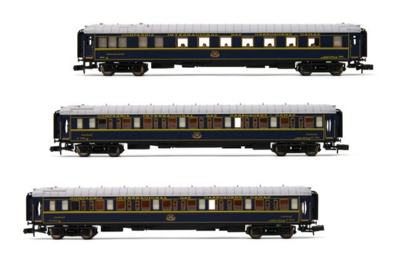 | Description | Coffret comprenant 3 voitures, 1 voiture lits T2 de la RENFE, 1 voiture lits T2 de la RENFE/CIWL et une voiture restaurant WL de la CIWL | |