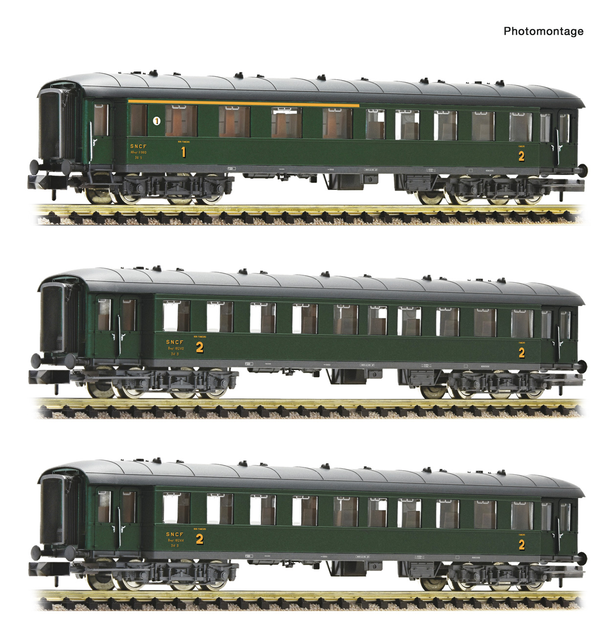 | Description | Coffret de trois voitures de voyageurs de type "Bastille", une voiture 1./2.Cl. abmyf, deux voitures 2.Cl. Bmyf | |