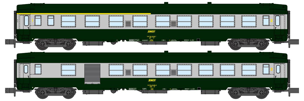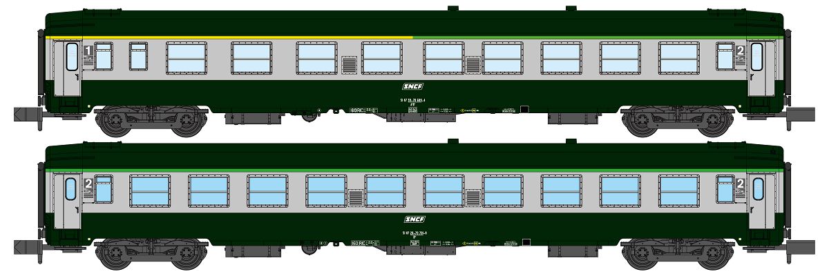 Coffret de deux voitures couchettes UIC 2.Cl. B9c9x à toit bas en