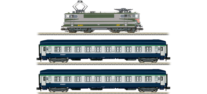11168 : Coffret de départ comprenant une locomotive BB 9231 en DCC sonore, deux voitures couchettes UIC 2.Cl., un ovale de rails et une commande digitale
