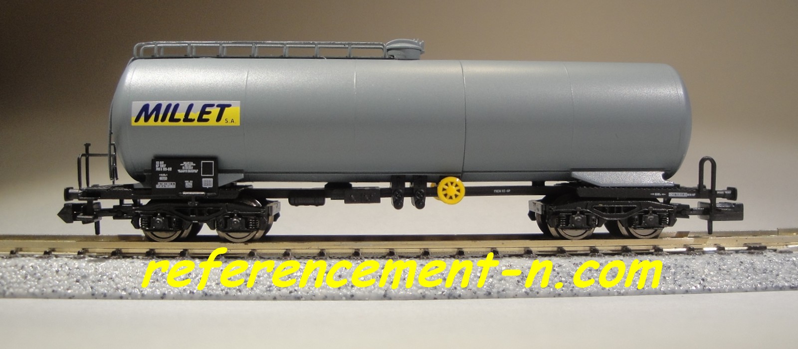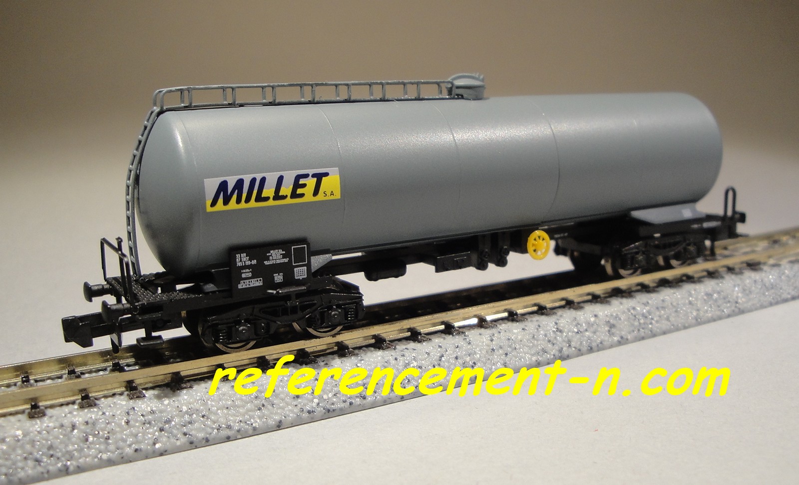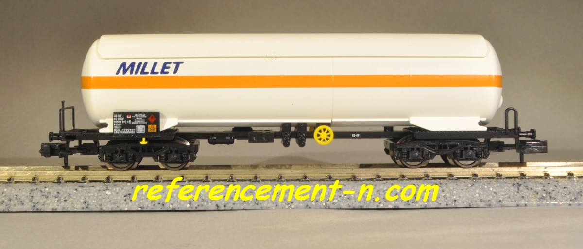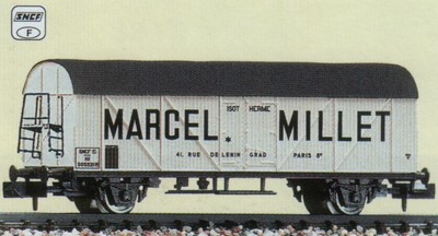 Couleur grise Marquage MILLET Attelage à élongation Comparez la première photo qui a été celle de la promotion de ce nouveau wagon (avec nouveau moule) et la seconde photo qui est celle du wagon réellement vendu réalisé à partir d'un moule ancien Annonce dans Rail Miniature Flash N° 548 de mars 2011 Annonce dans Le Train N° 285 de janvier 2012 |
