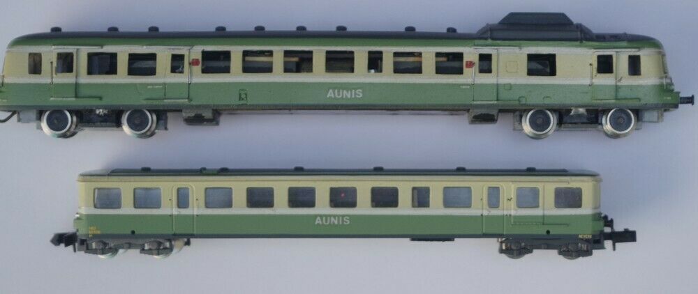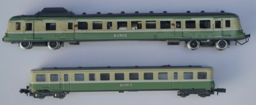 Couleurs verte et crème avec bande argent Autorail X-2800 sur base Vapeur70 Remorque sur base XR Transmondia Marquages AUNIS sur les faces latérales Motorisation BGR Il manque les jupes de bas de caisse spécifiques à cette version 7 autorails X-2800 ont porté la livrée AUNIS Livrée verte et beige Série de sept autorail en 1.Cl. uniquement Quelques remorques Decauville XR-7100 ont reçues la même livrée Historique du modèle réel X-2800 Historique du modèle réel XR-7100 |