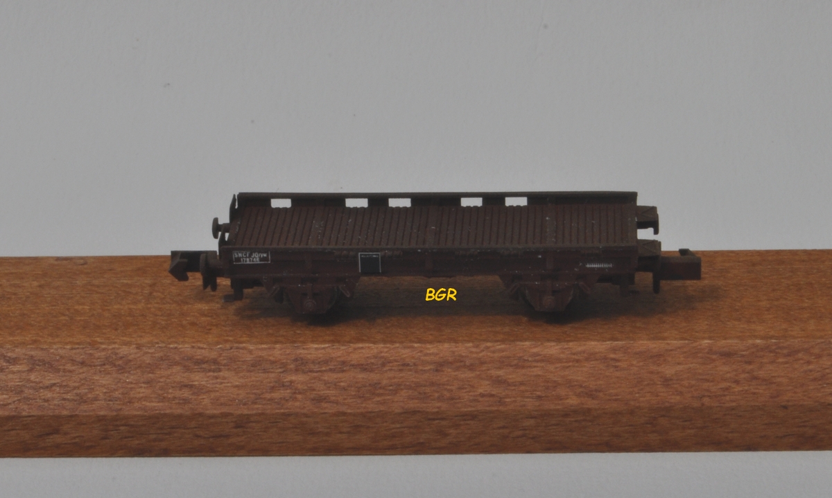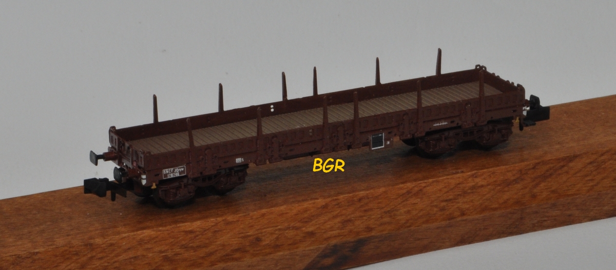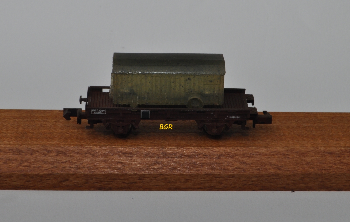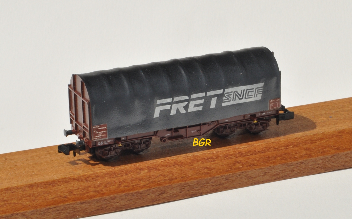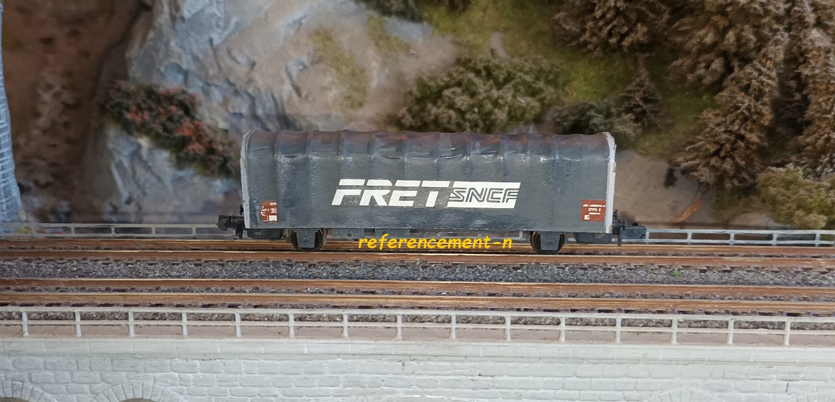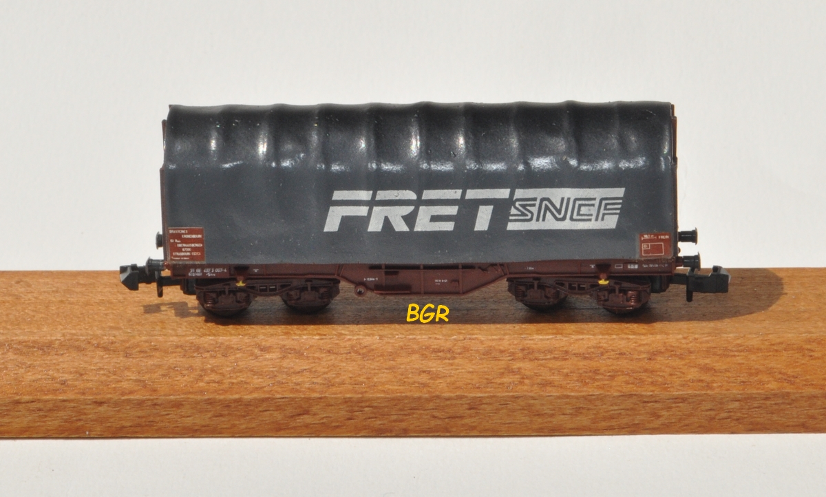 Bâche grise, châssis brun UIC Marquage FRET SNCF en blanc Superstructure en résine Bogies et châssis Shis Roco |