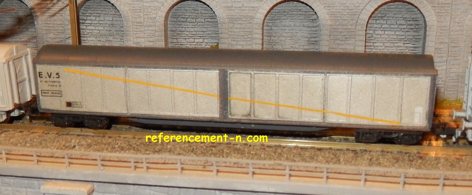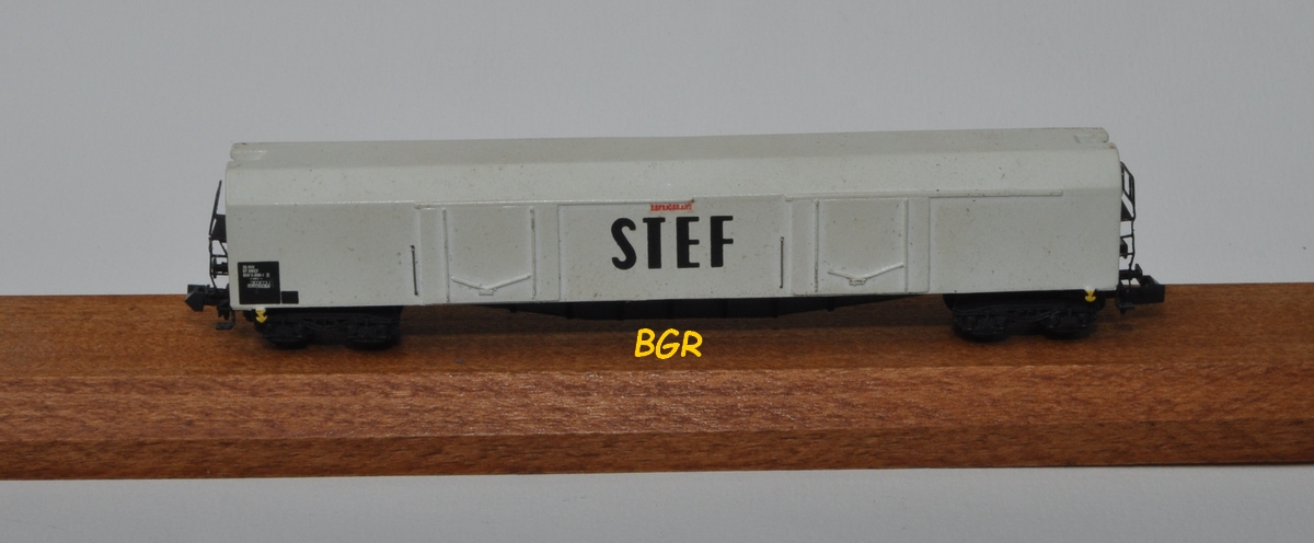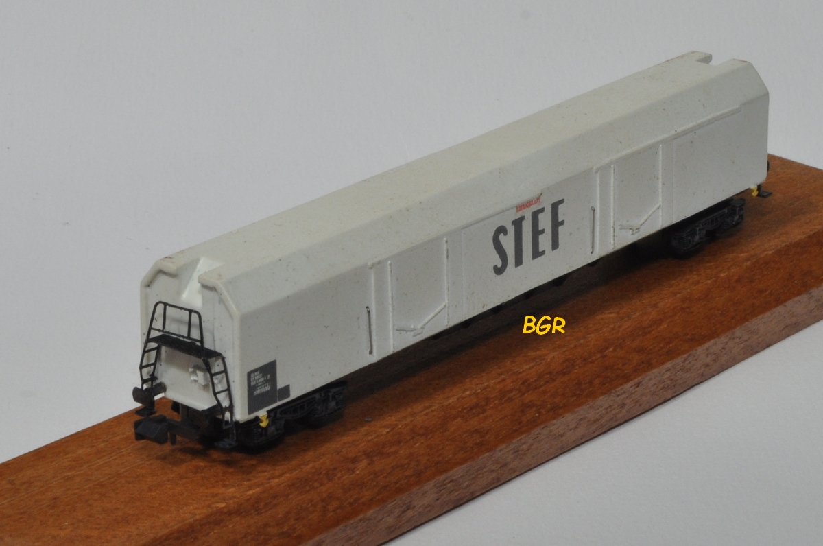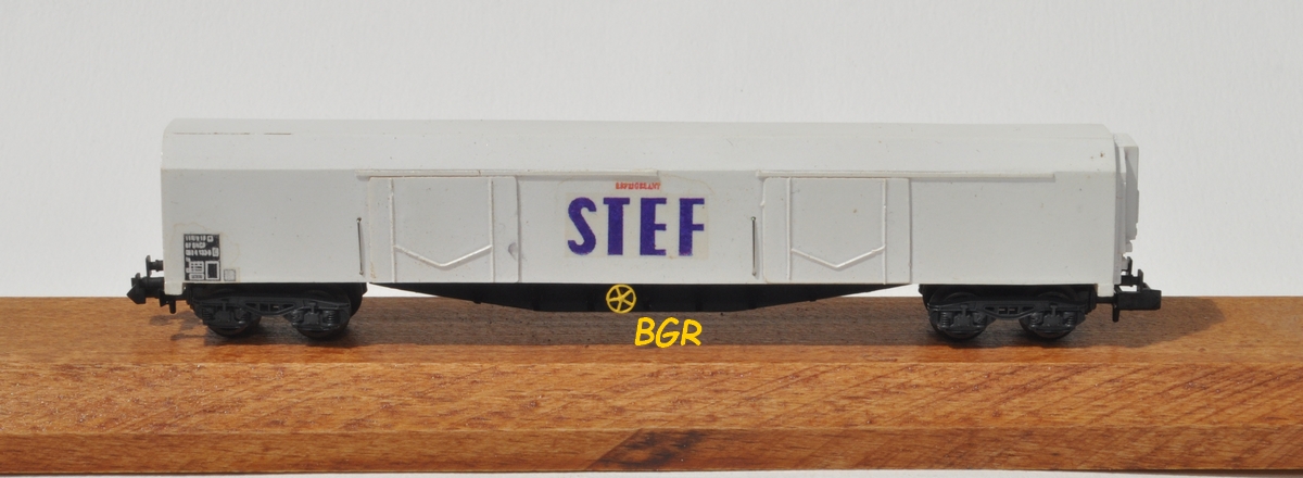 toit gris avec châssis noir Marquage STEF en noir et rouge Base wagon Arnold réf. 4224 |