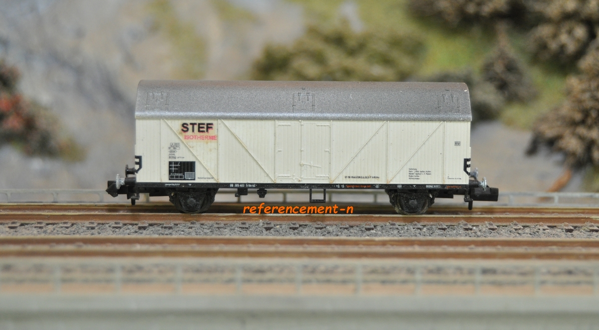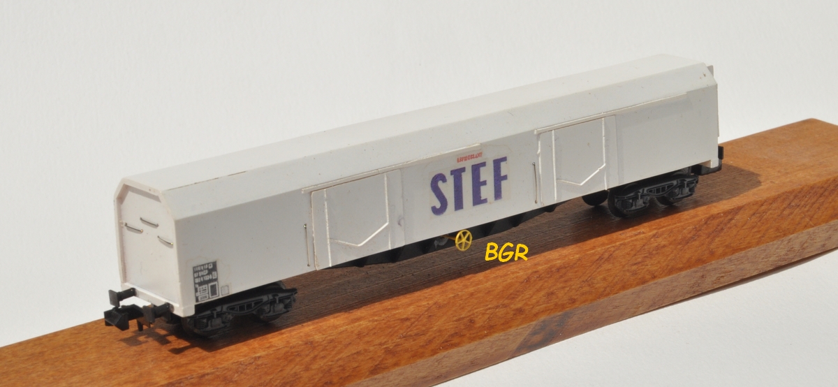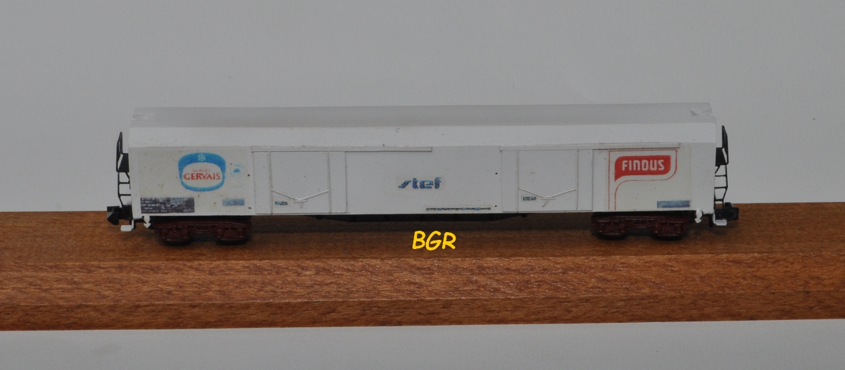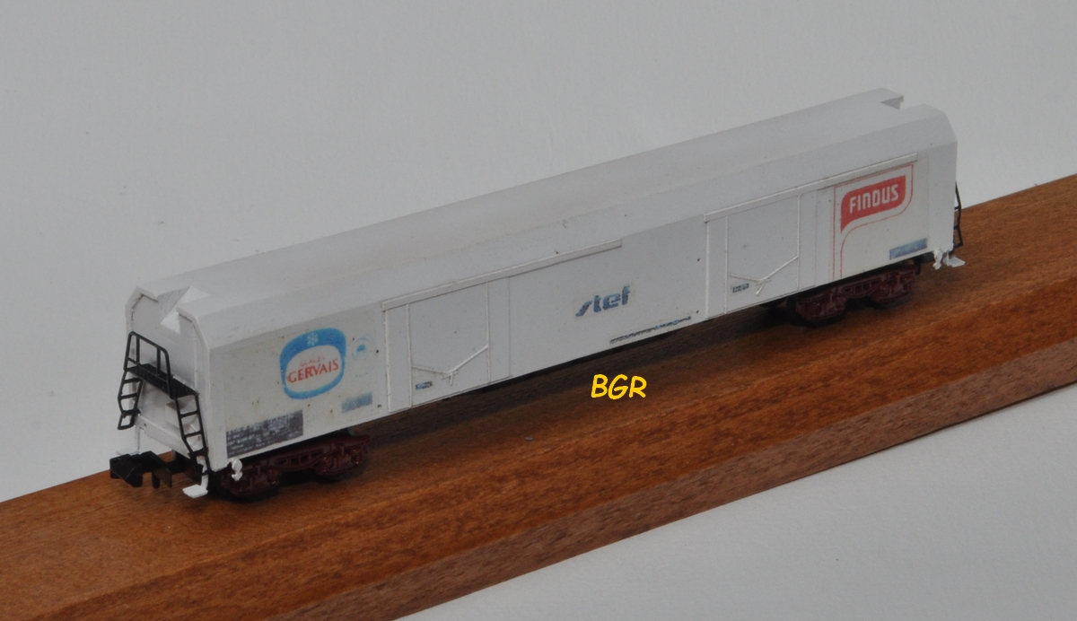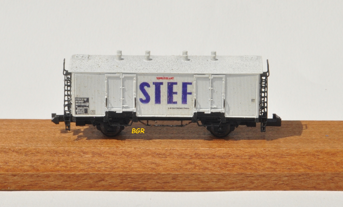 châssis noir Marquage STEF en bleu et logos GERVAIS et FINDUS Caisse et châssis en résine Bogies Roco Echelles prises sur un wagon du commerce |
