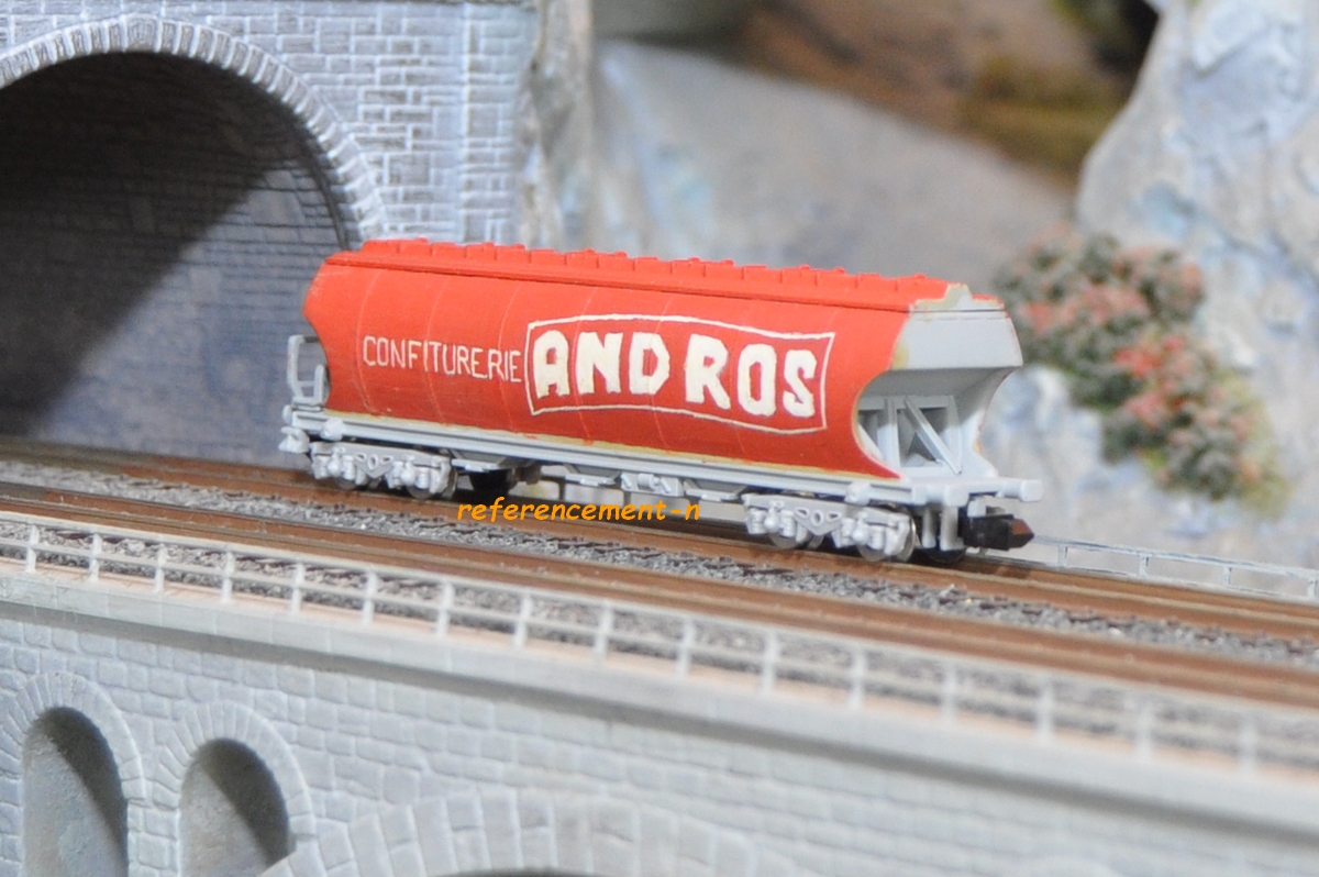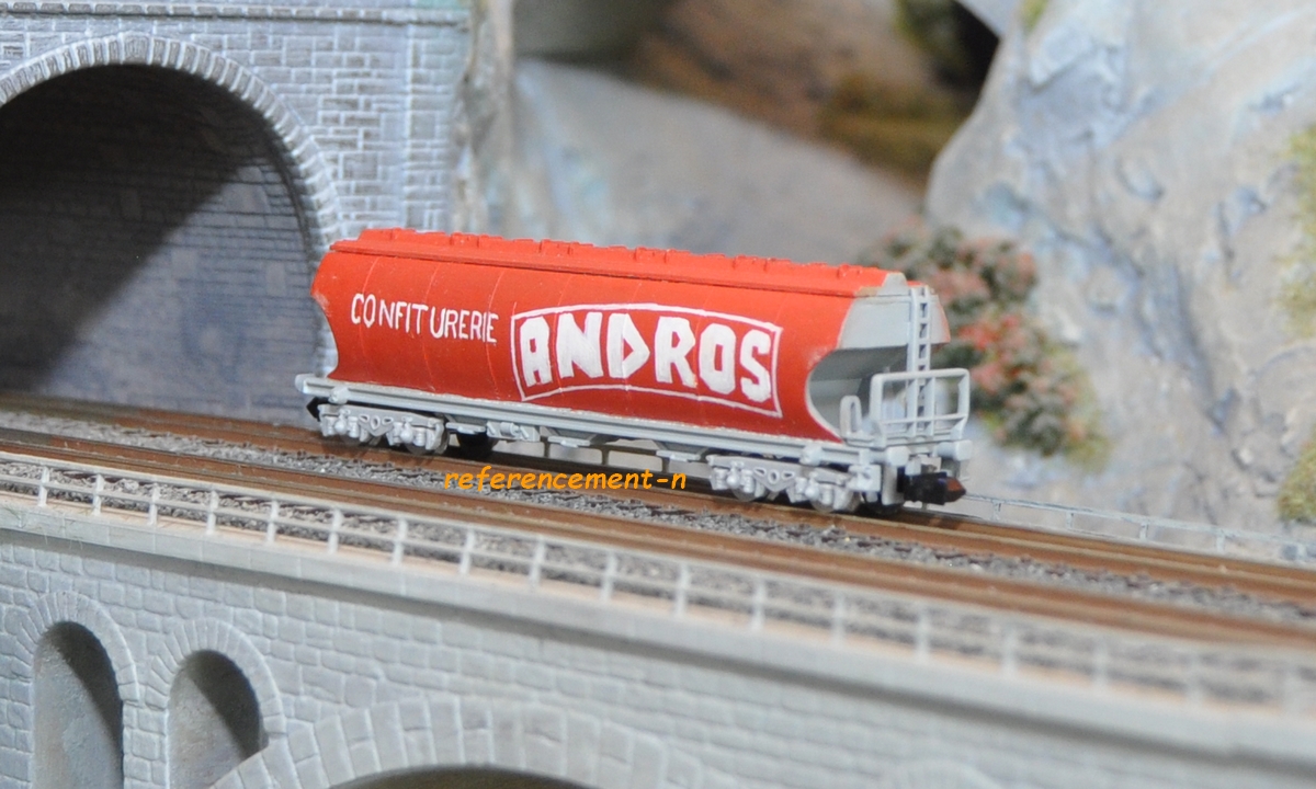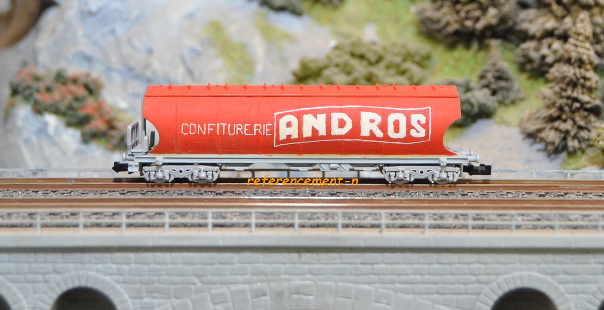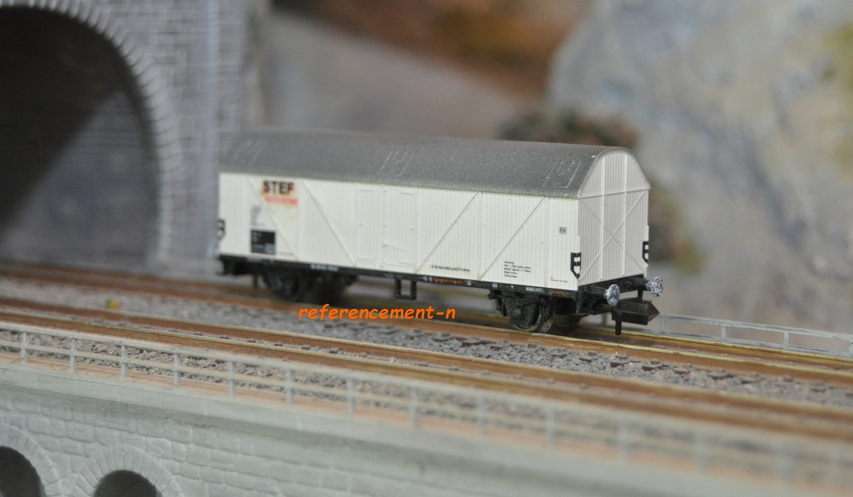 châssis noir Marquage STEF en bleu et logos GERVAIS et FINDUS Caisse et châssis en résine Bogies Roco Echelles prises sur un wagon du commerce |