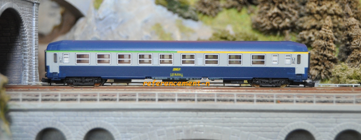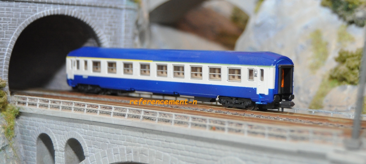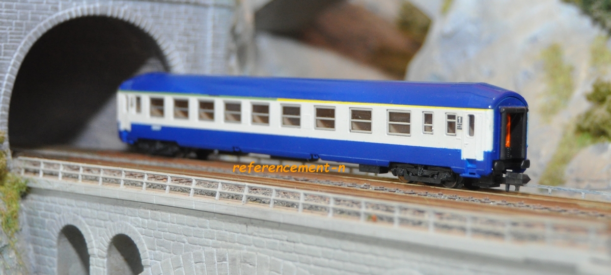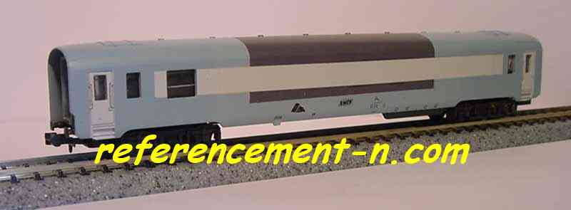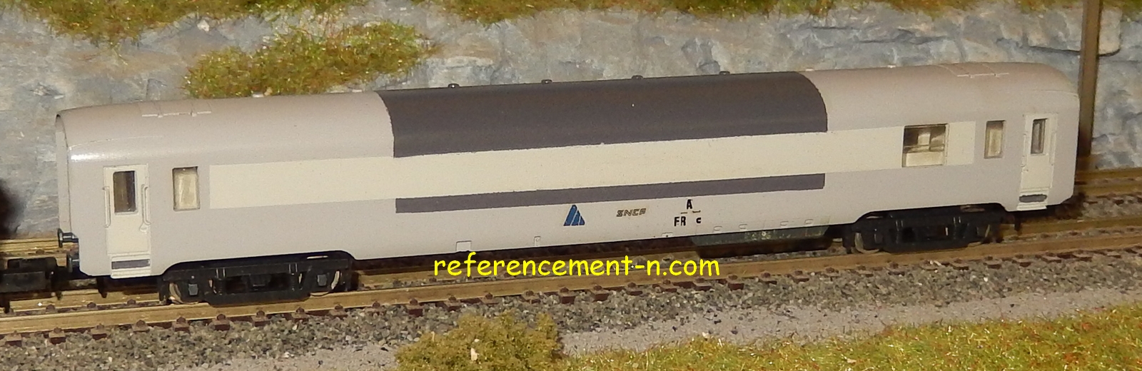 Voiture réalisée sur base voiture C102 Artrain et toit de voiture C103 Livrée bleu et gris Cartouche Corail Logo et marquage UIC jaune |