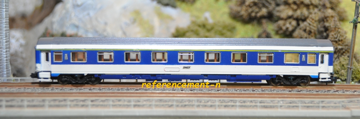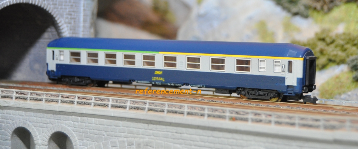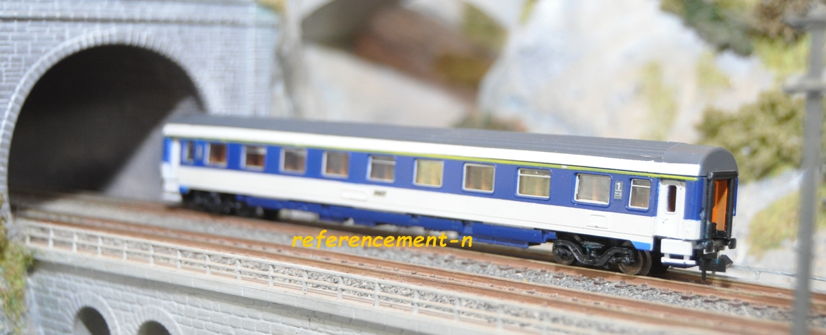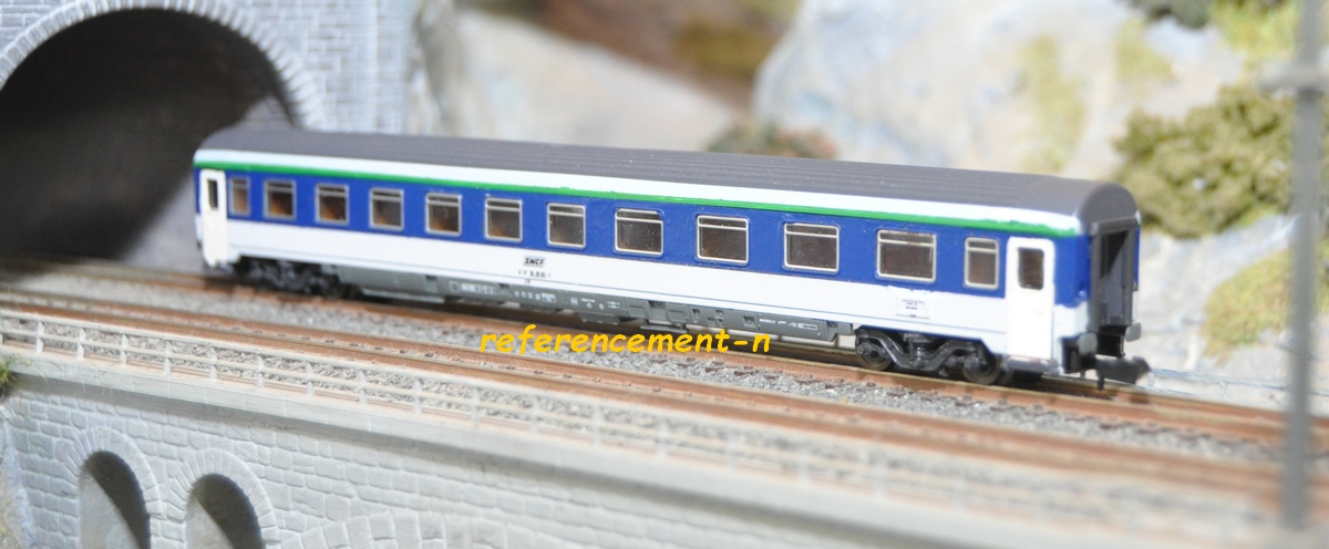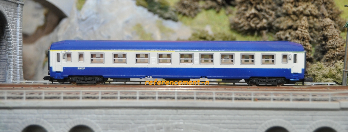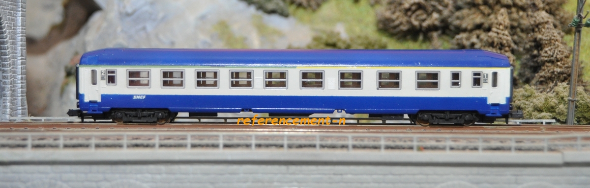Voiture réalisée sur base voiture C102 Artrain et toit de voiture C103 Livrée bleu et gris Cartouche Corail Logo et marquage UIC jaune |