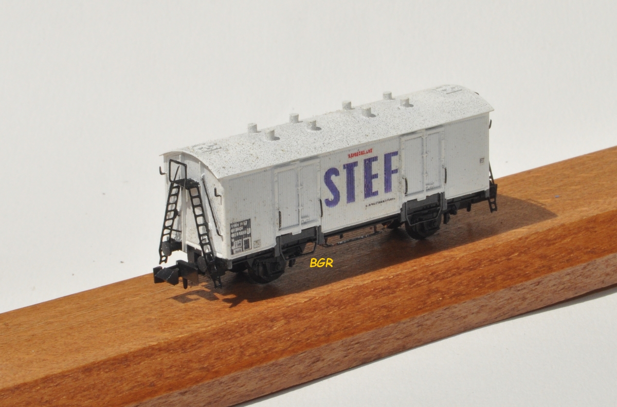 châssis noier Marquage Stef en bleu Caisse et châssis en résine Modèle modifié par la suppression des échelles et ajout d'un groupe réfrigérant Bogies Roco |