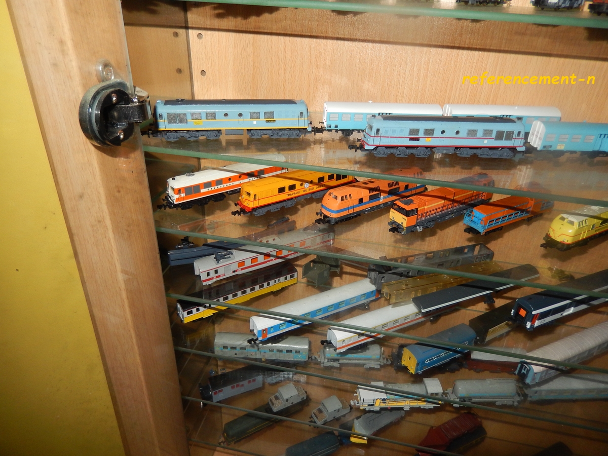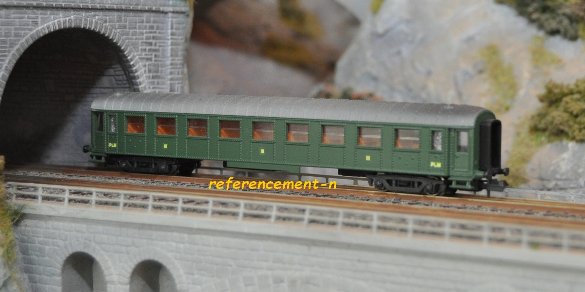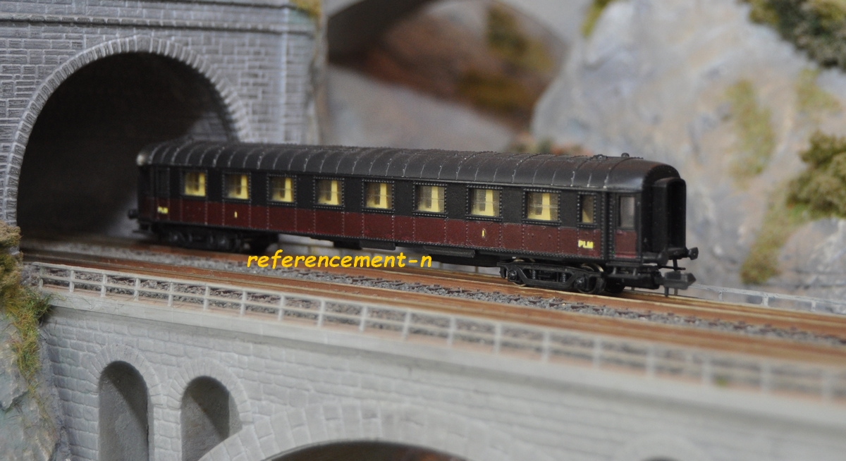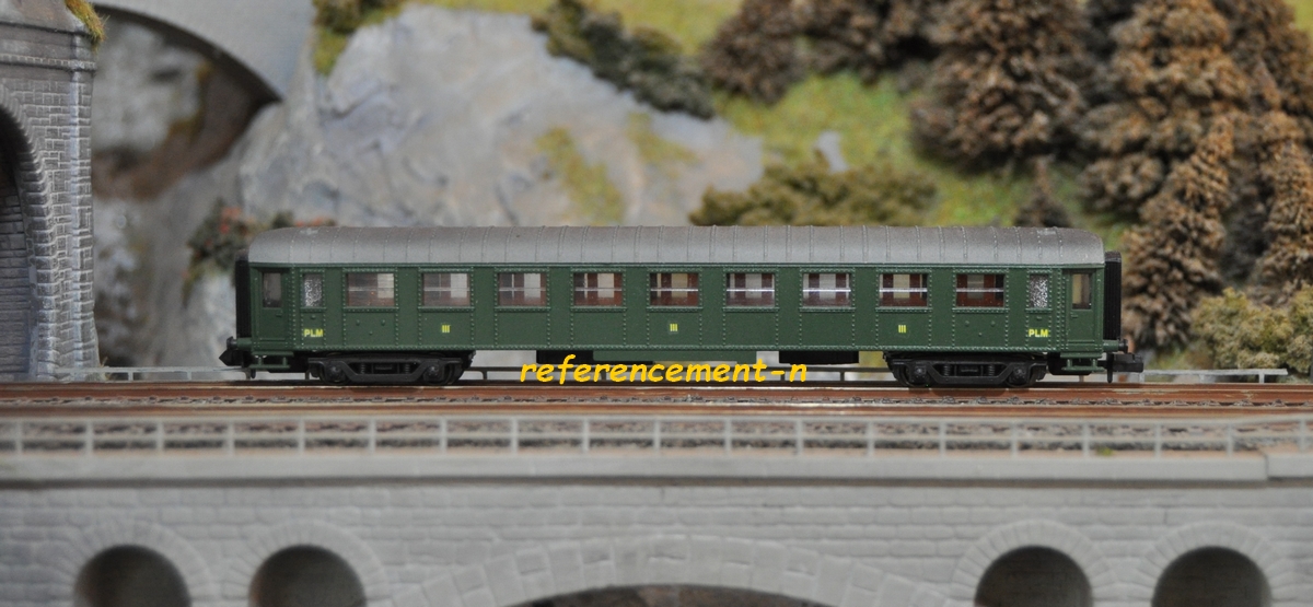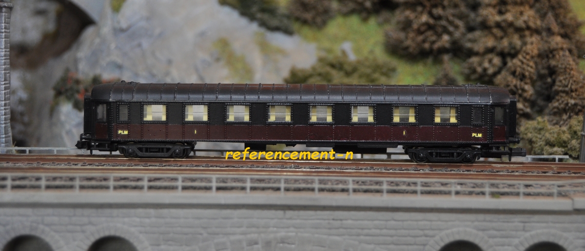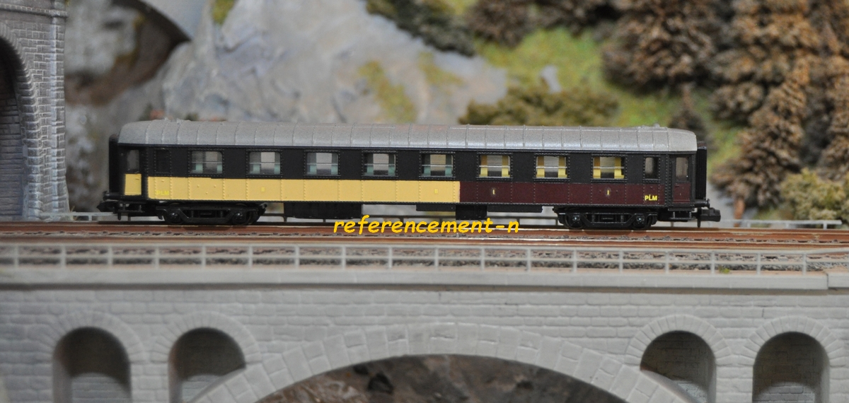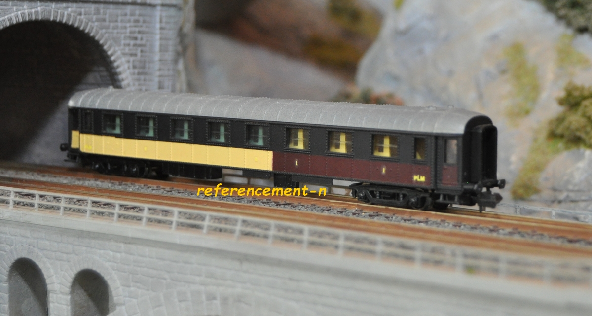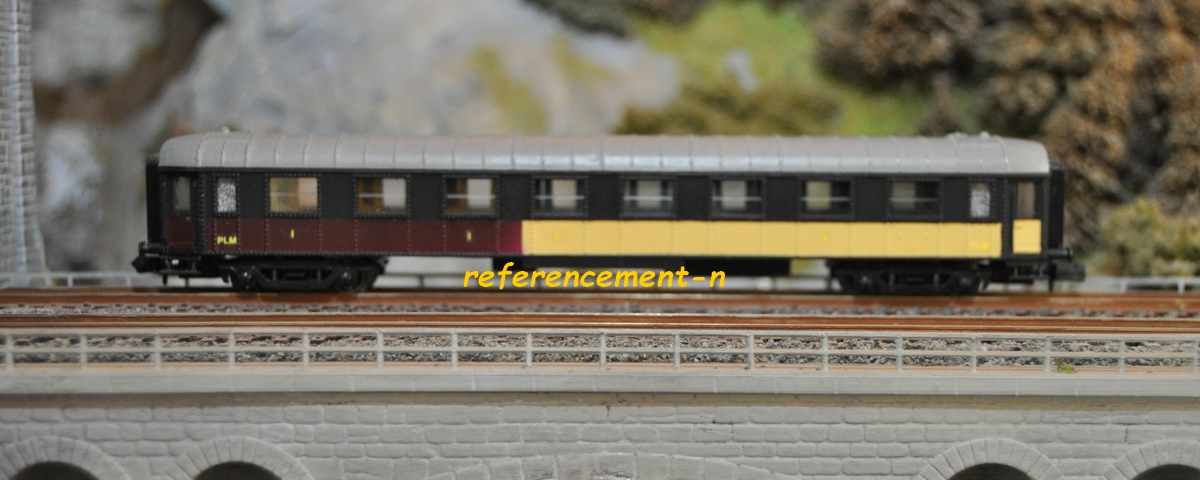 en plusieurs exemplaire afin de composer une rame complète Voiture réalisée à partir de voitures OCEM Dyman avant la sortie du coffret composé de quatre voitures OCEM PLM composant cette rame par Transmondia Logos et marquages PLM en jaune Aménagements intérieurs peints aux teintes PLM |