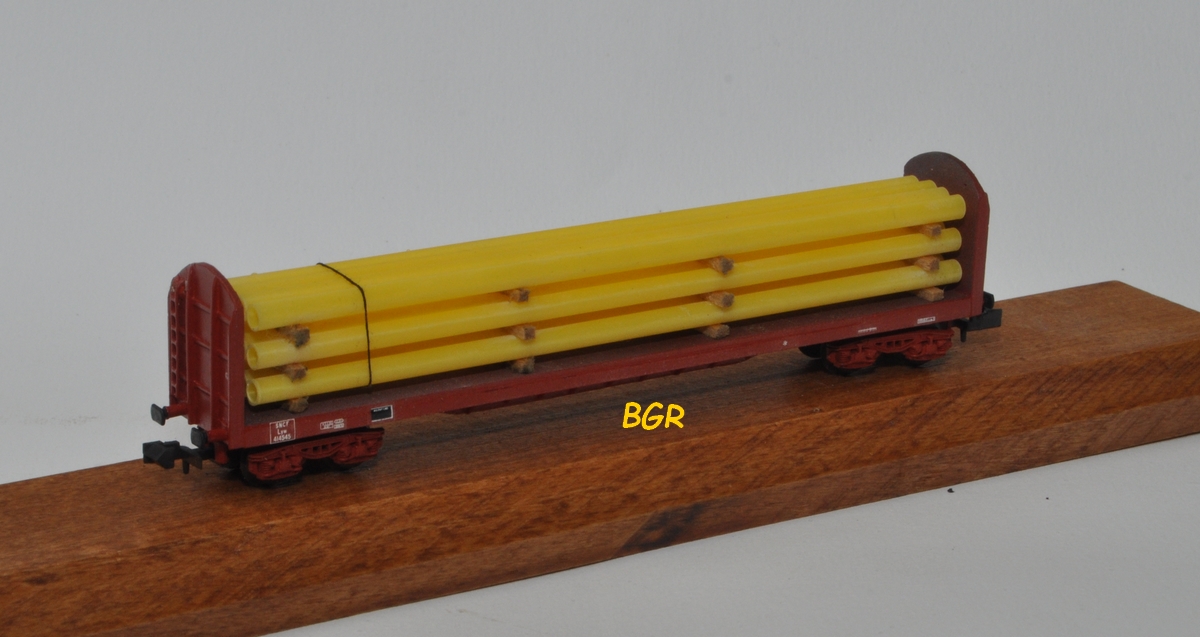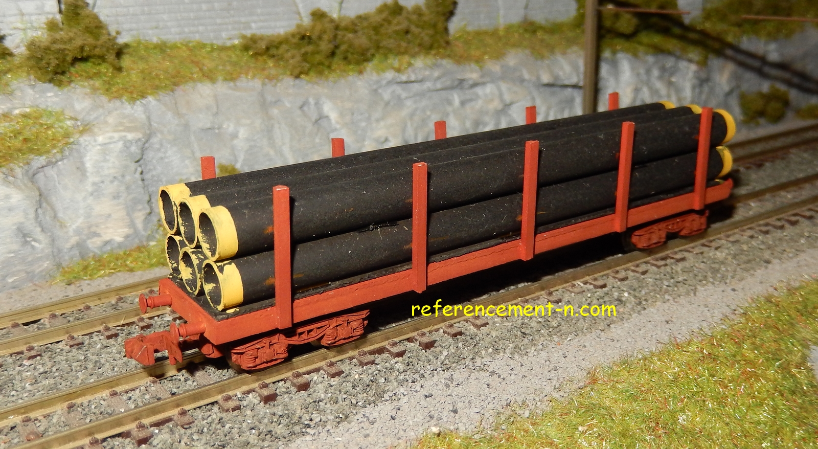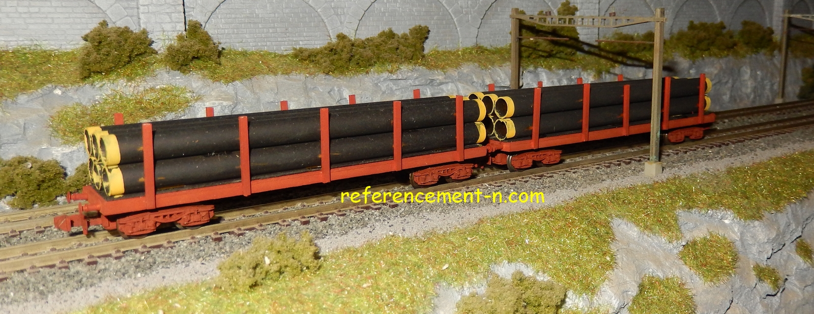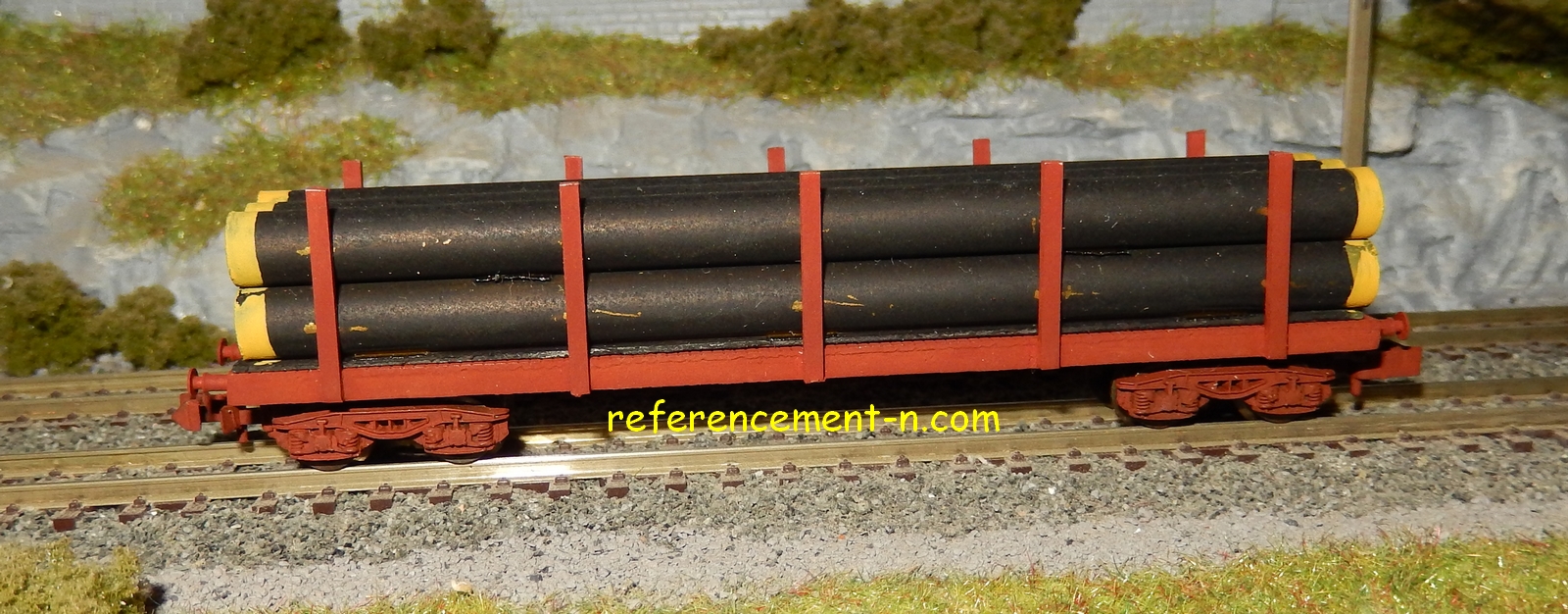 | Description | Wagon plat à bogies et ranchers porte tubes | |