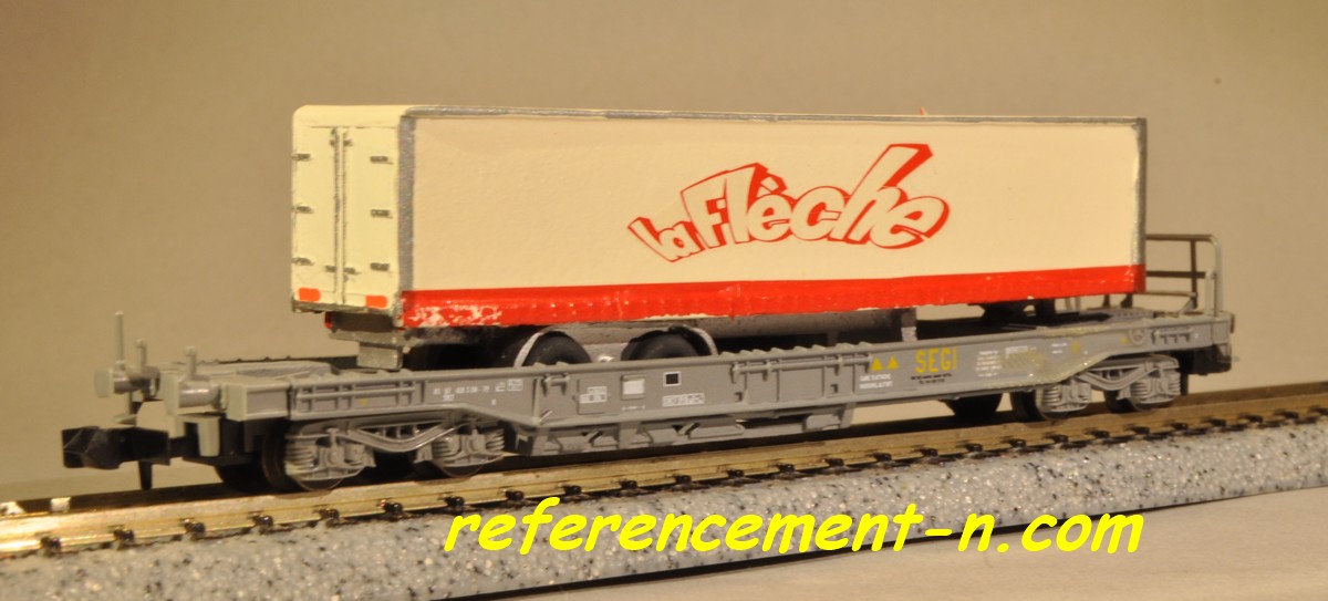| Description | Wagon Poche 2 boggies type Gs gris chargé 1 semi remorque frigorifique blanc LA FLÈCHE (provenance Vapeur70) sur base wagon SEGI SNCF | |