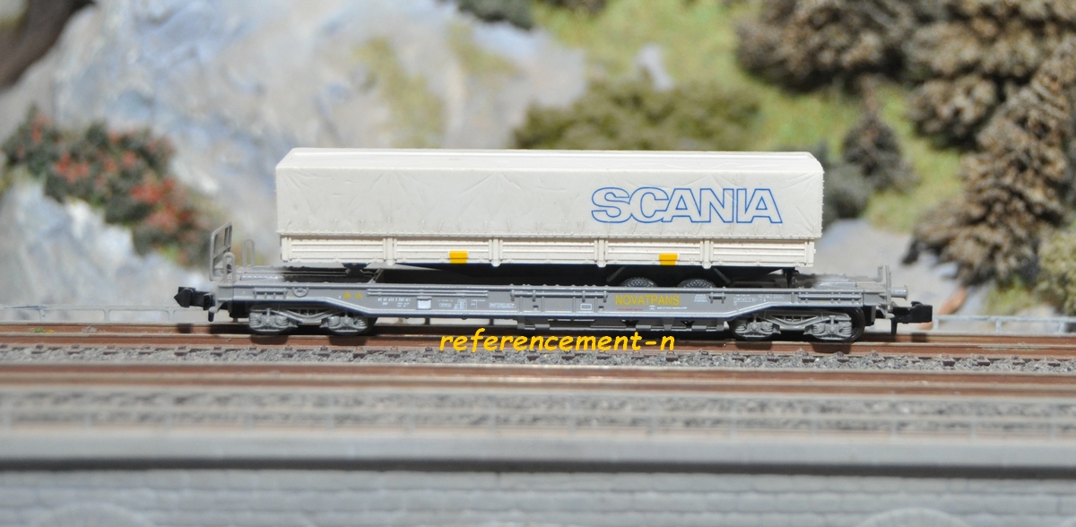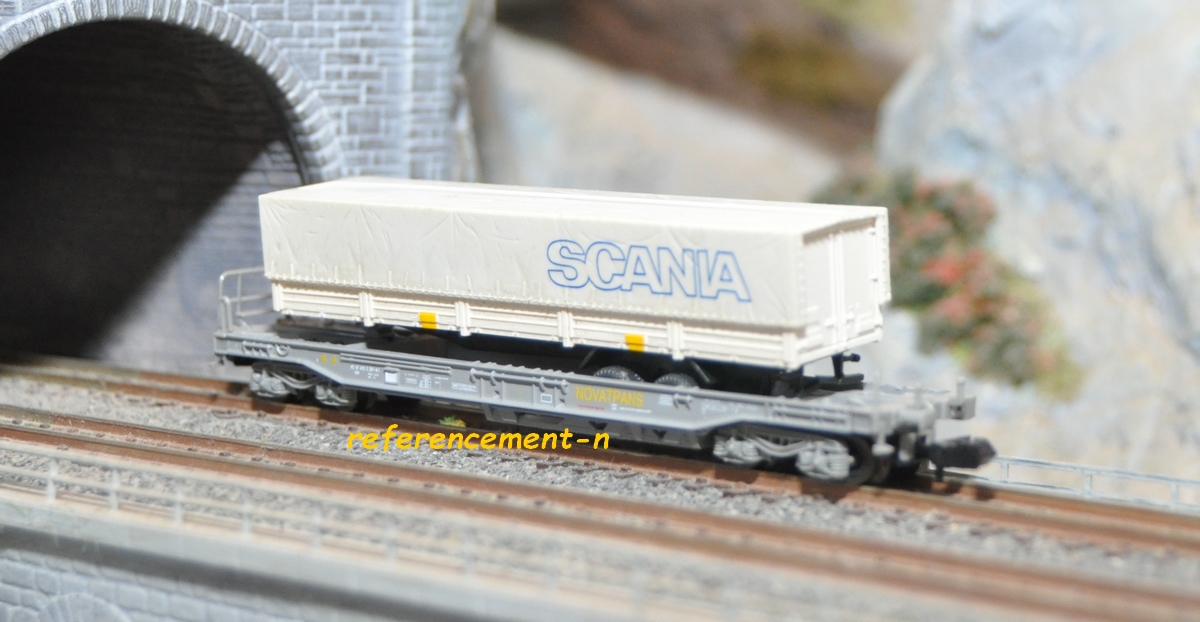 | Description | Wagon Poche 2 boggies type Gs gris chargé 1 semi remorque blanc avec marquages SCANIA sur base wagon HUPAC SNCF | |