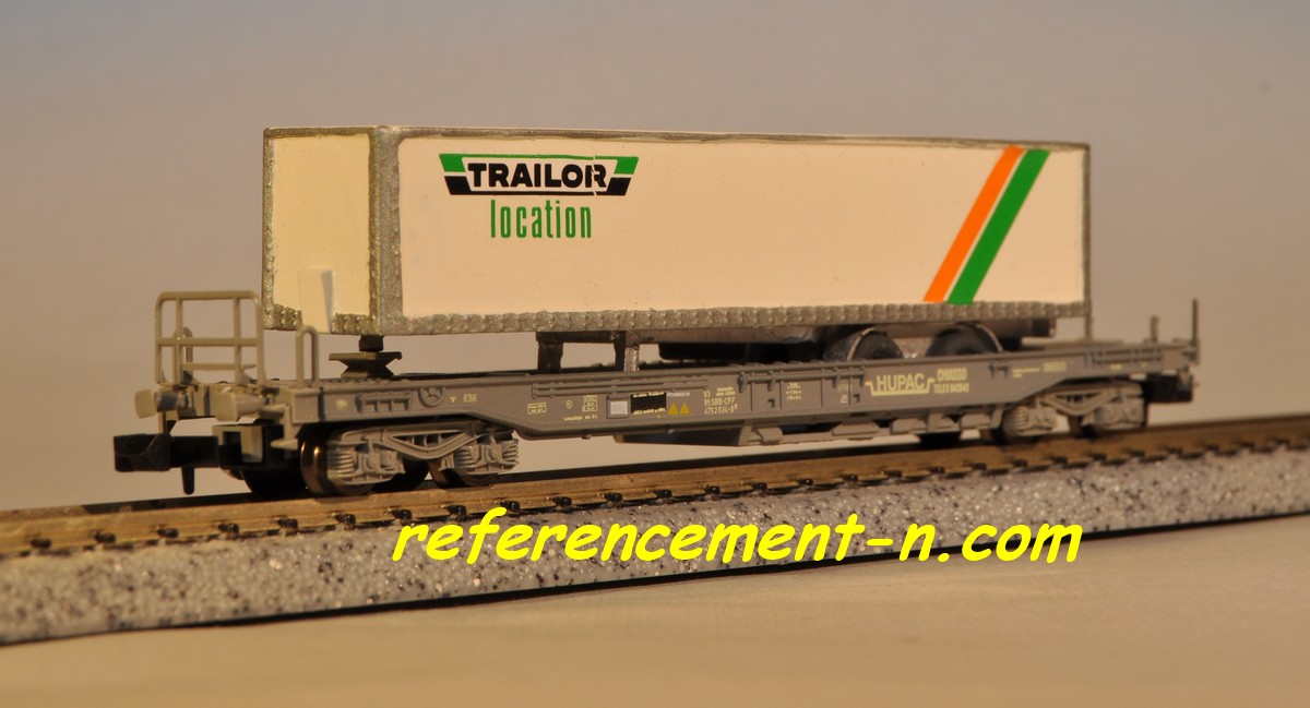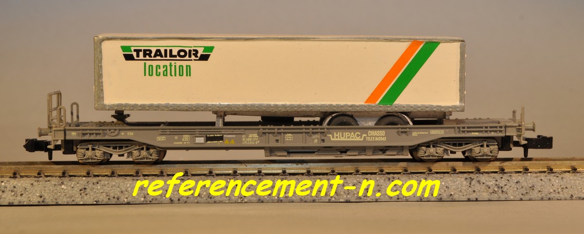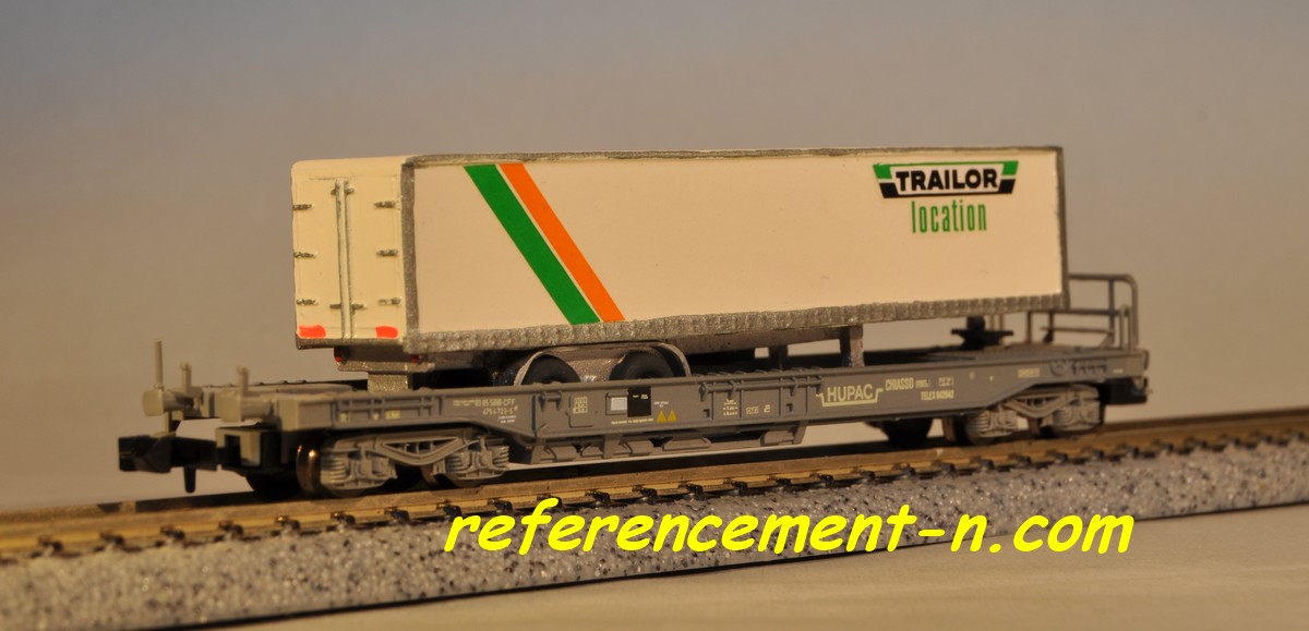 | Description | Wagon Poche 2 boggies type Gs gris chargé 1 semi remorque blanc TRAILOR LOCATION (provenance Vapeur70) sur base wagon HUPAC SNCF | |