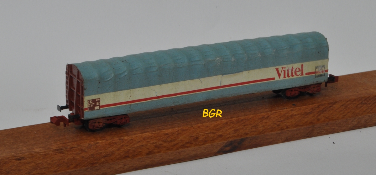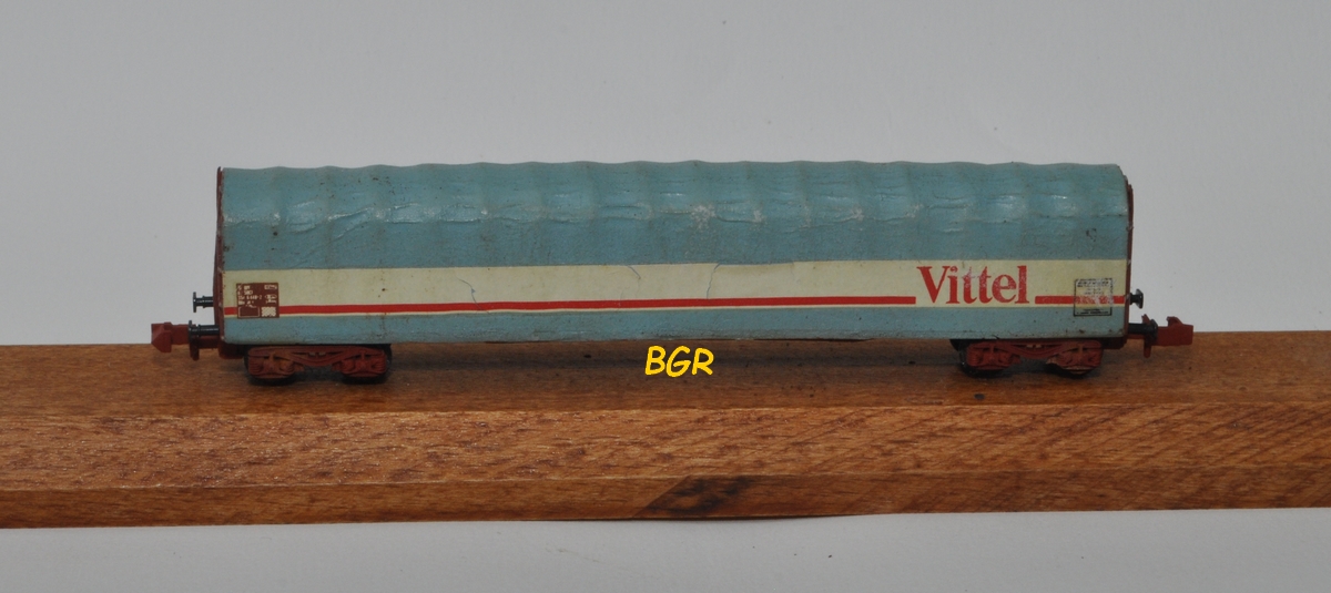 blanche, châssis brun UIC Marquage Vittel en rouge sur fond blanc Wagon en résine Bogies Roco |