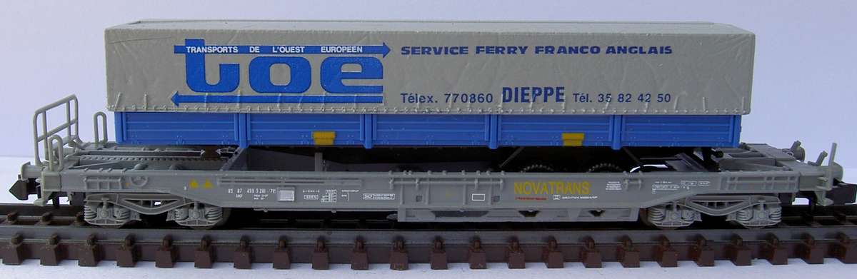 | Description | Wagon Poche 2 boggies type Gs gris chargé 1 semi remorque bleu et gris TOE Dieppe sur base wagon NOVATRANS SNCF | |