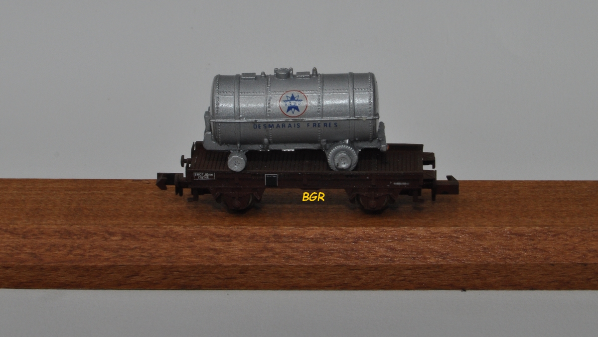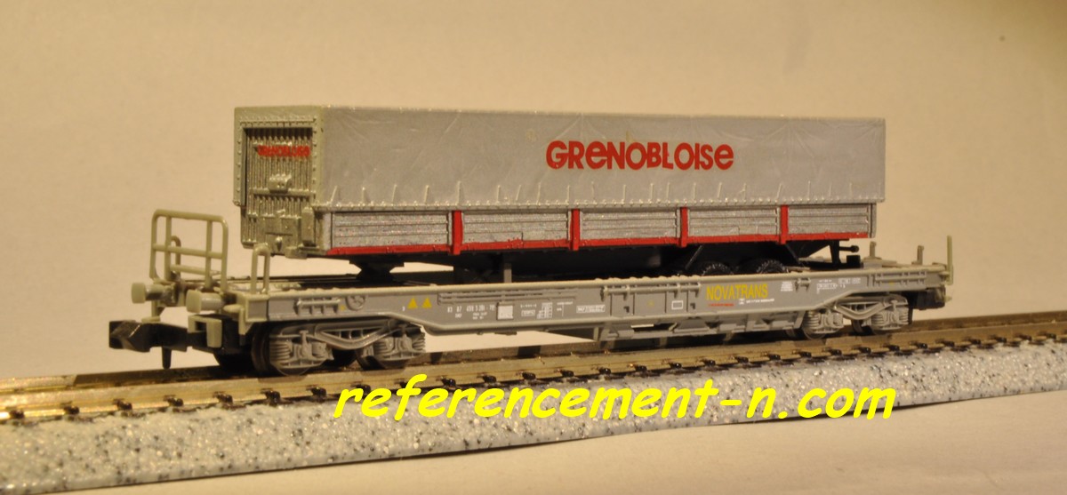| Description | Wagon Poche 2 boggies gris chargé 1 semi remorque gris TV sur base wagon NOVATRANS SNCF | |