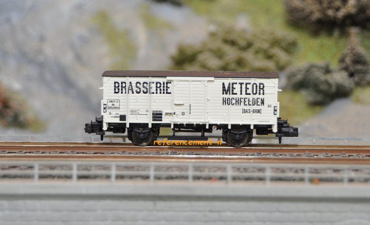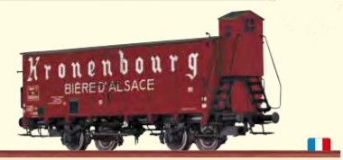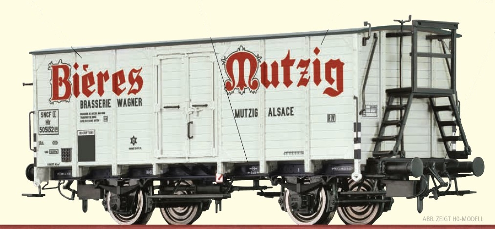 et toit noir Marquage Bières Mutzig en rouge Notez la présence d'une guérite serre-freins sur le modèle vendu alors qu'il ne devait y avoir qu'une passerelle serre-freins Attelages courts à élongation Longueur : 60,0 mm |