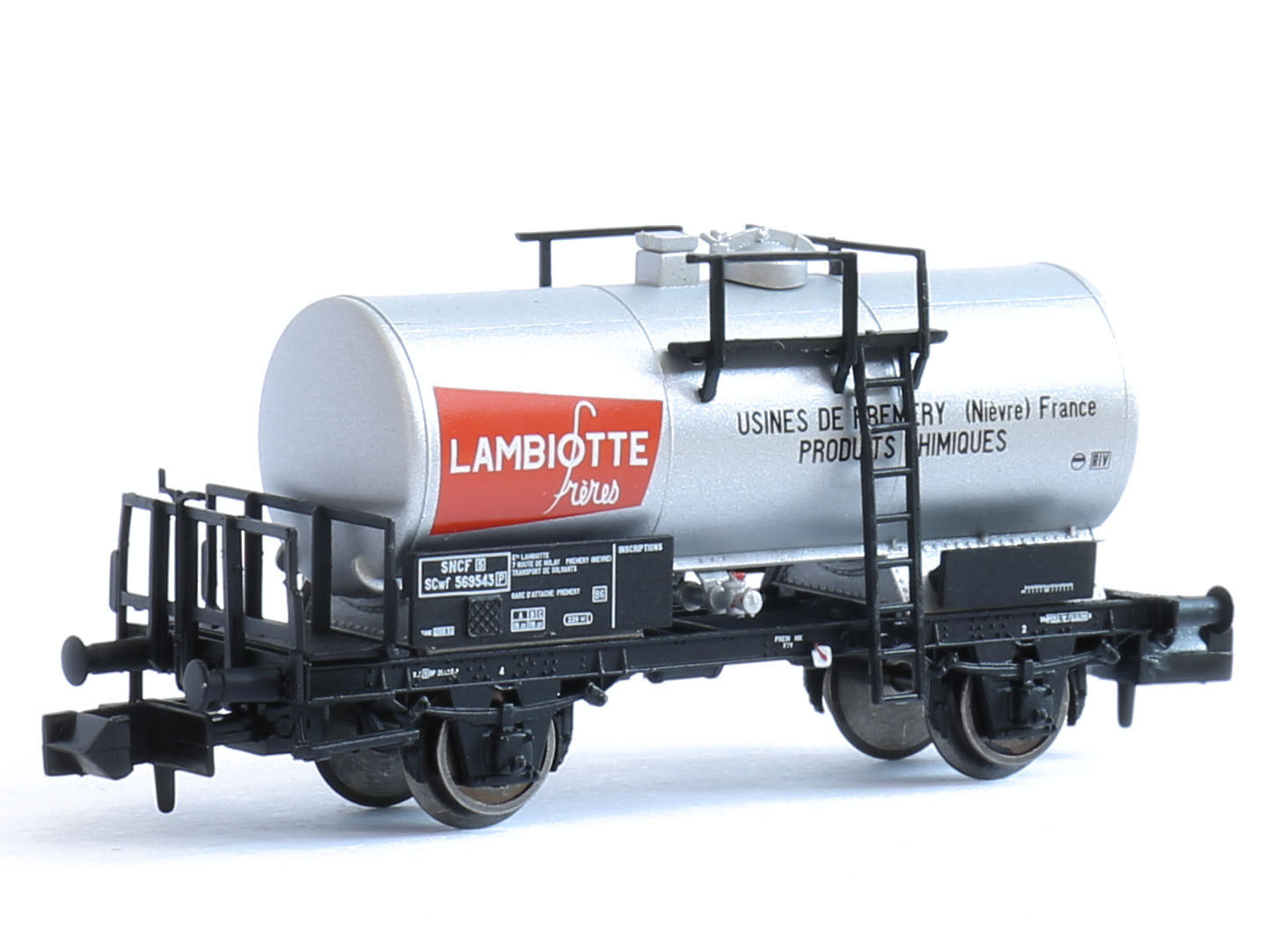 | Description | Wagon citerne à bogies et passerelle serre freins type SCw | |
