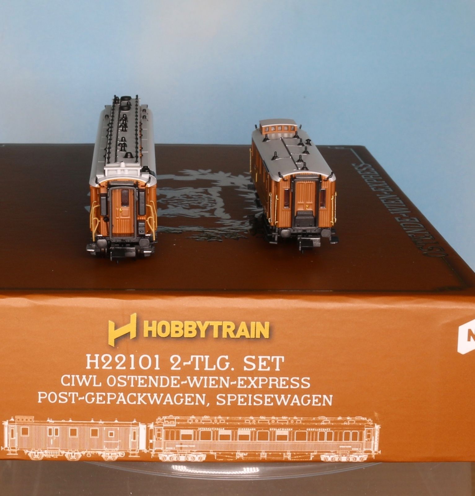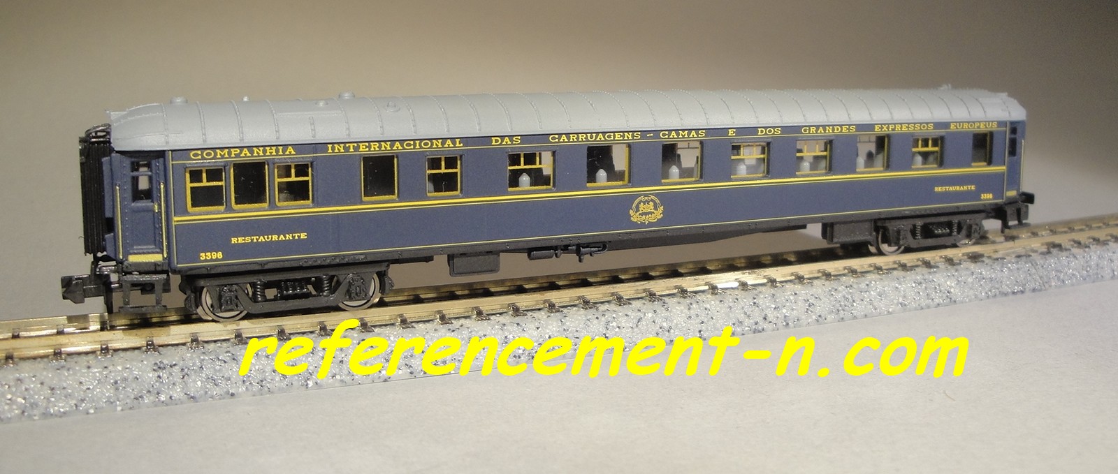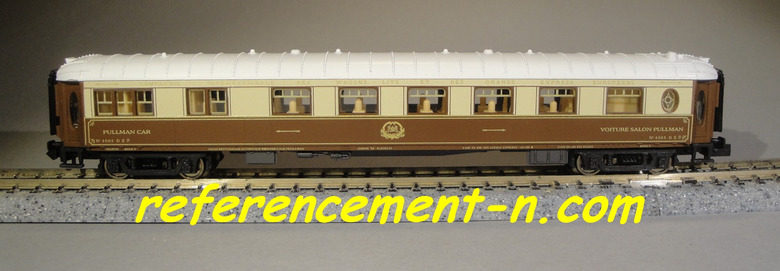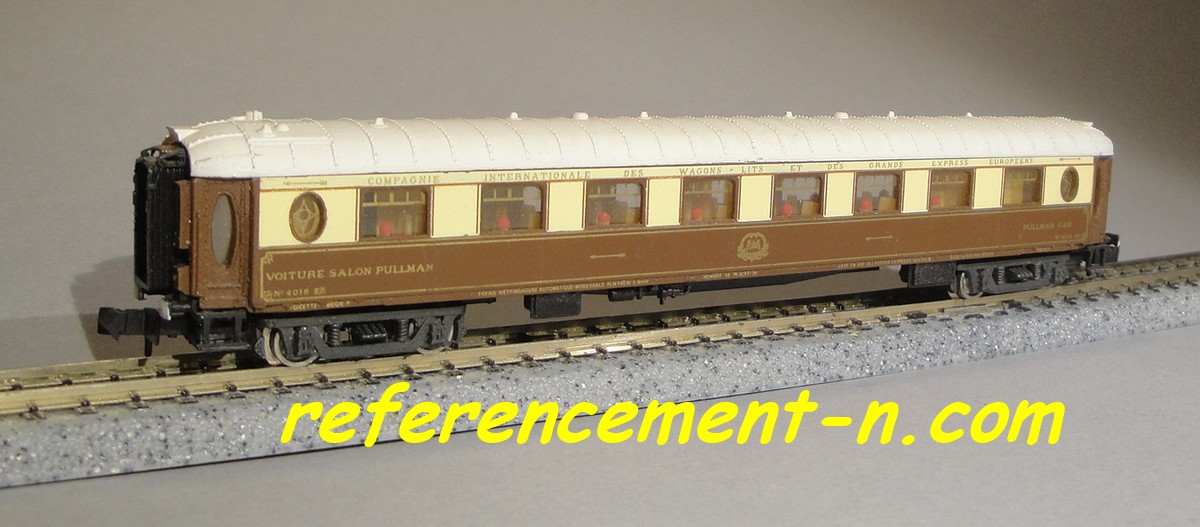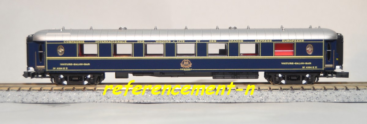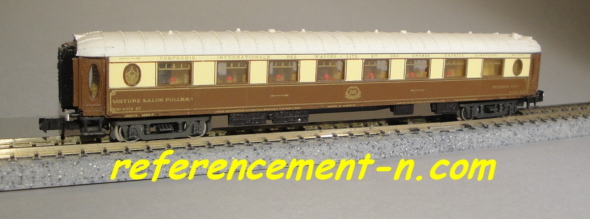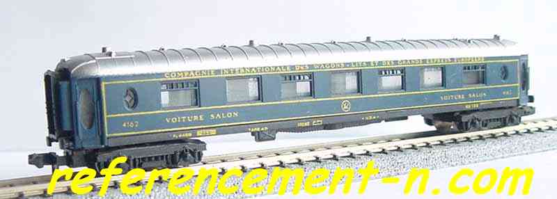 une voiture salon CIWL et une voiture pulmann CIWL, d'un ovale de rails,