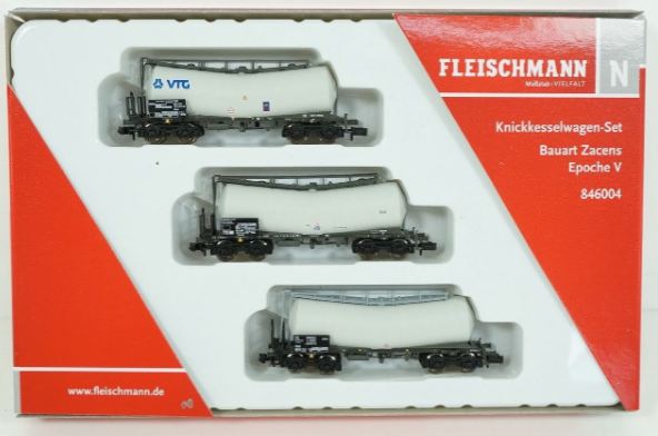 | Description | Coffret de trois wagons citernes coudées à bogies blancs type Zacens avec plateforme | |