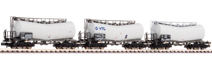 | Description | Coffret de trois wagons citerne à bogies gris et noirs | |