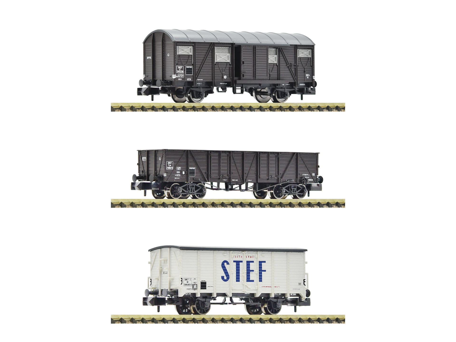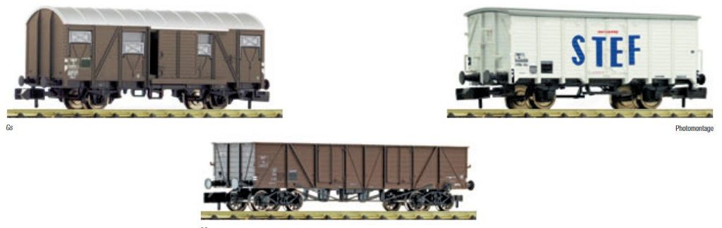 | Description | Coffret de trois wagons comprenant un couvert Gs brun fonçé, un wagon G10 blanc STEF et un tombereau TP brun fonçé | |