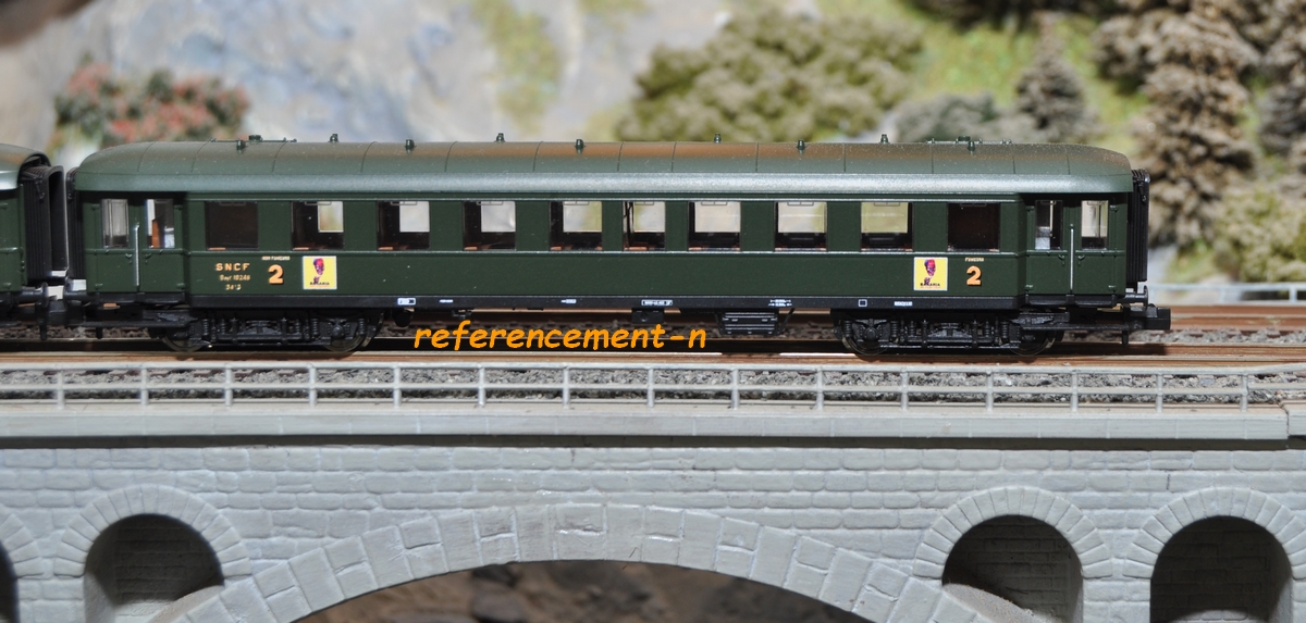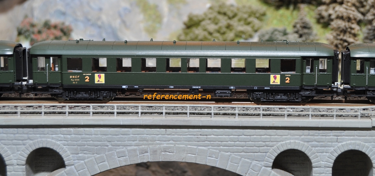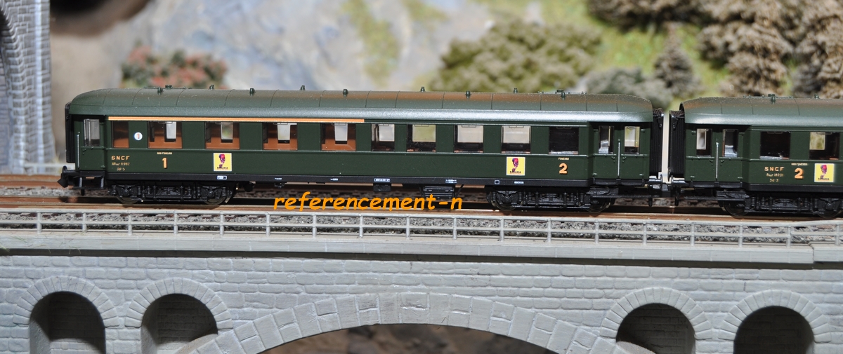 Composition de 2 voitures 2.Cl. et d'une voiture mixte 1/2.Cl. Couleur verte avec toit gris Publicité Banania sur les côtés des voitures Reprise de moules Roco Longueur : 393 mm |