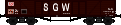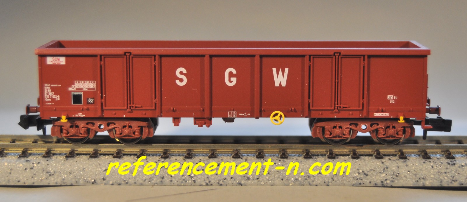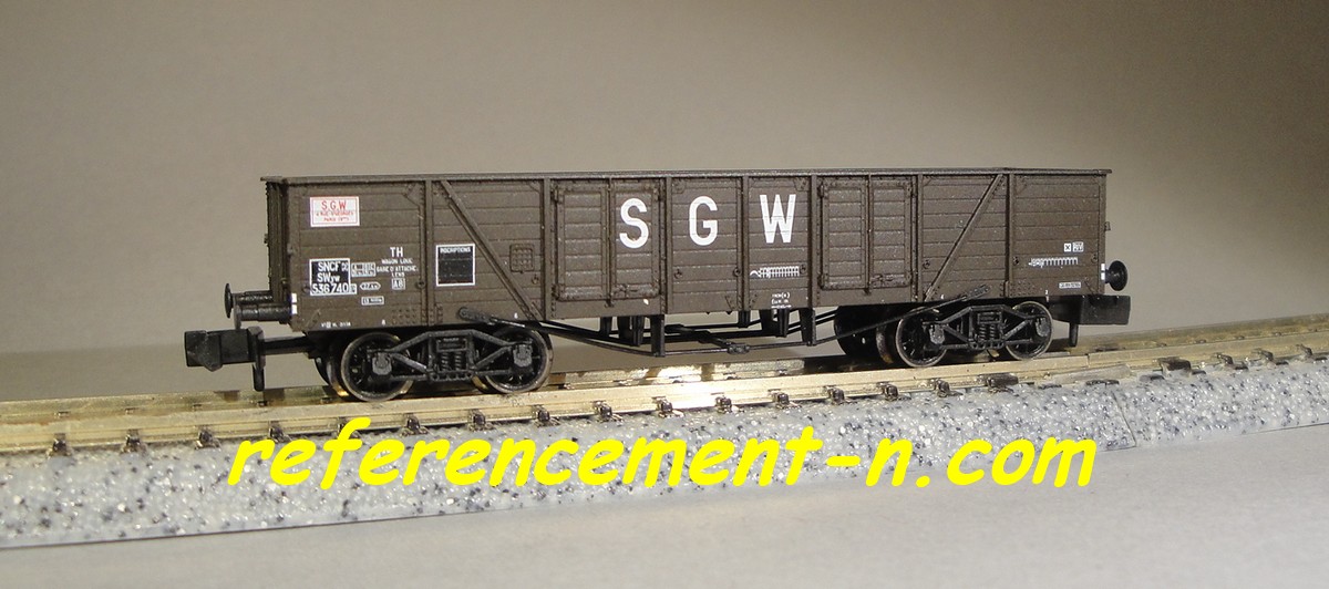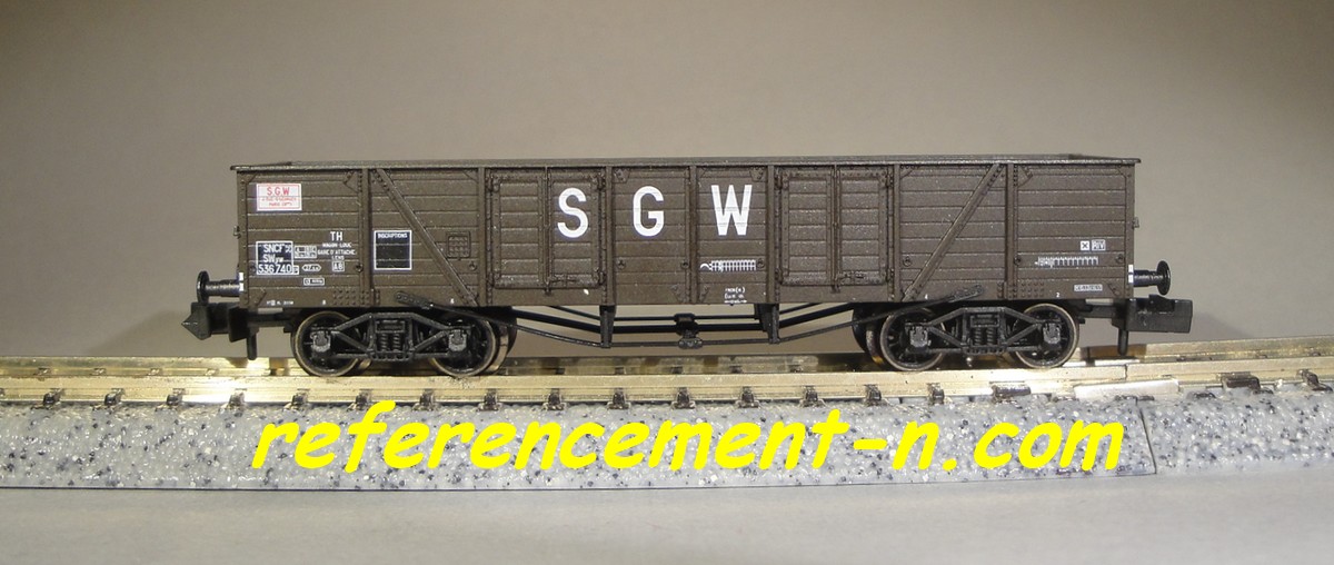 | Description | Wagon tombereau bois boggies brun foncé TP marquage SGW | |