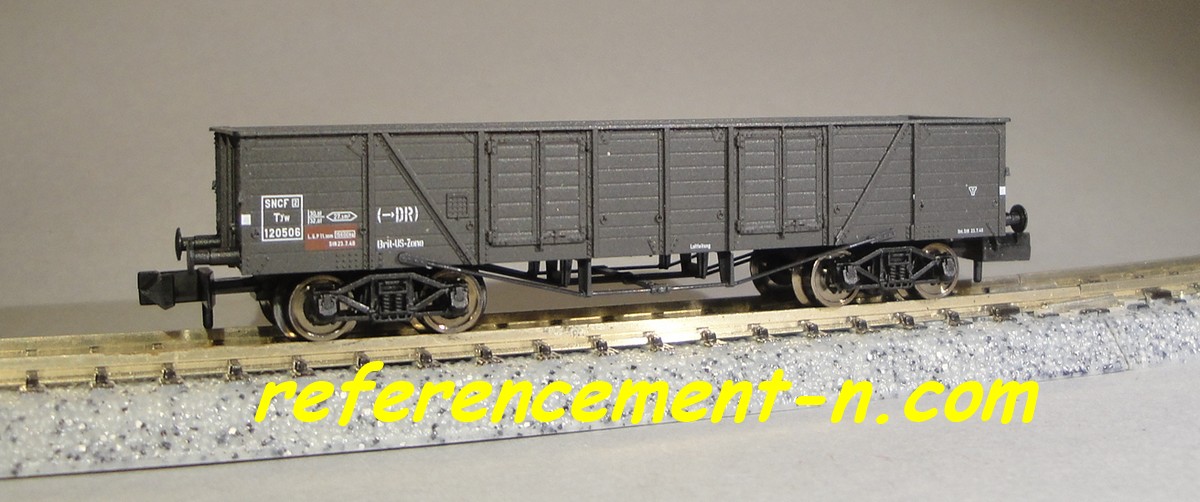 matériel DR prise de guerre US et cédé ensuite à la France C'est pourquoi il possède les marquages des trois propriétaires successifs Roues pleines Attelage NEM Longueur : 77 mm |