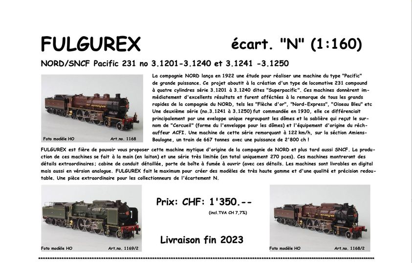 2D2 PO Superpacific Nouveautés annoncées en 2020 mais annulés en juin 2023 1166 : 262 BD 1 PLM, 3 baies frontales, carénée, "présentation officielle", bleu/toit blanc cassé, ép. IIb (1166s : version digitalisée) 1166/1 : 262 AD1 PLM, 2 baies frontales, carénée, bleu/crème, ép IIbn (1166/1d : digitalisée) 1166/2 : 262 BD 1 PLM, 3 baies frontales, carénée, bleu/crème, avec monogramme PLM, ép. IIb (1166/2d : digitalisée) 1167 : 262 AD 1 SNCF, 2 baies frontales, plaques SNCF, bleu/crème, ép. IIIa (1167d : digitalisée) 1167/1 : 262 AD 1 SNCF, 2 baies frontales, carénage déposé, bleu/crème, ép. IIIb (1167/1d : digitalisée) 1167/2 : 262 BD 1 SNCF, 3 baies frontales, jupes raccourcies, monogramme SNCF, bleu/crème, ép. IIc (1167/2d : digitalisée) 1167/3 : 262 BD 1 SNCF, 3 baies frontales, jupes raccourcies, plaques SNCF, bleu/crème, ép IIIb (1167/3d : digitalisée Annonce dans Rail Miniatire Flash N° 647 de mars/avril 2020 Annonce dans Loco Revue N° 896 de mars 2022 Pacific Nord : livrées Nord et SNCF, plusieurs variantes avec ou sans pare-fumées, réchauffeur... Annonce dans Rail Miniature Flash N° 664 de janvier / février 2023 Annonce de la sortie par Fulgurex en juin 2023 pour fin 2023 ![]()