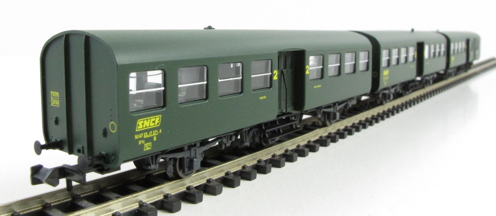 | Description | Coffret de trois voitures modernisée Sud-Est à 3 essieux 1.Cl. et 2.Cl. | |