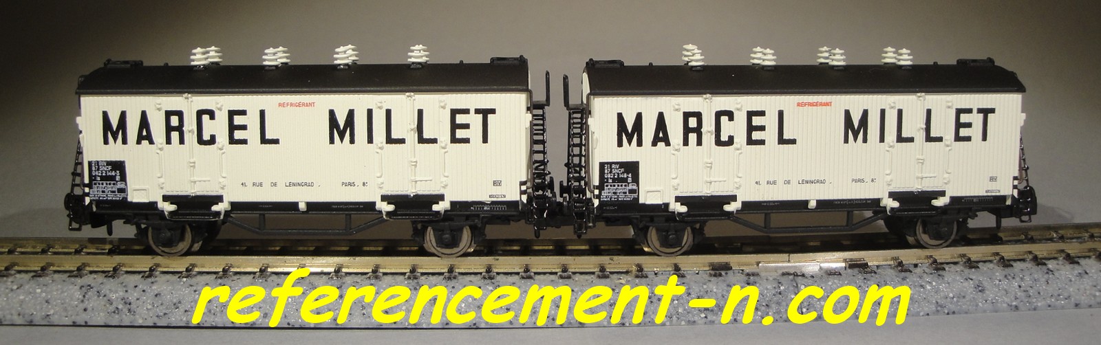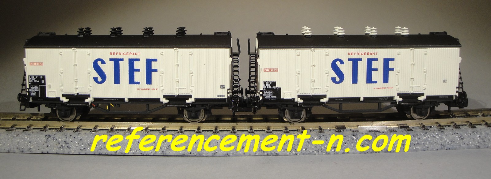 | Description | Coffret de 2 wagons isothermes type Hi à parois bois blanches, toits noirs et aérateurs blancs | |