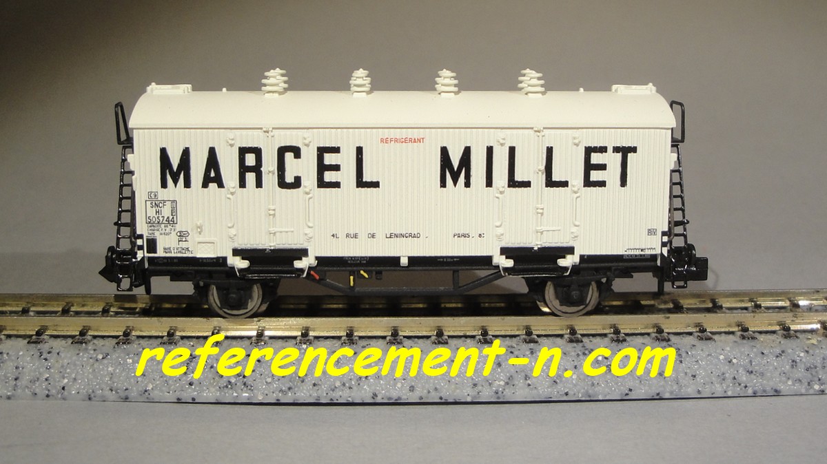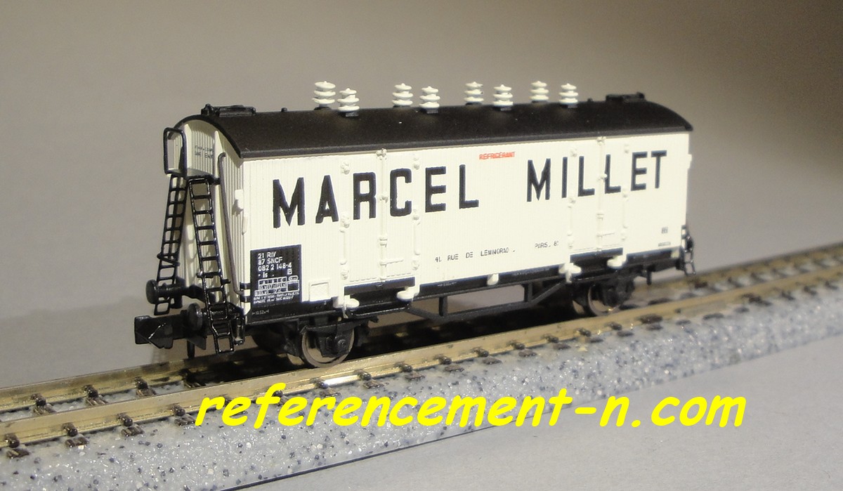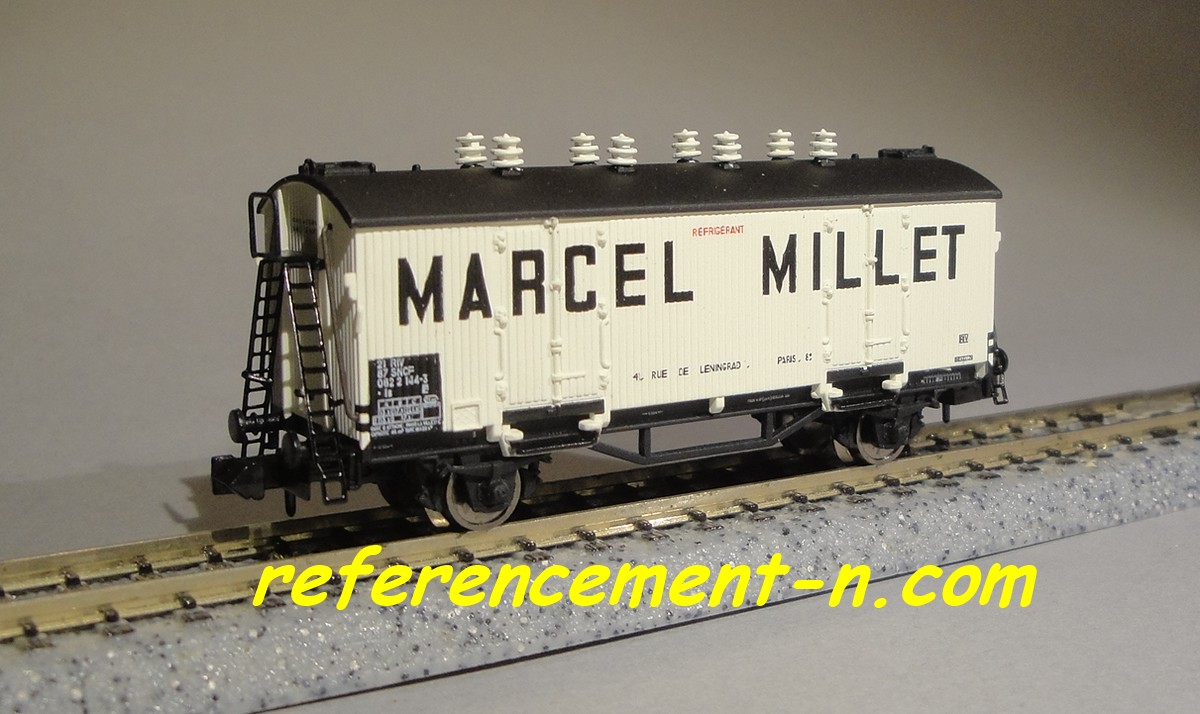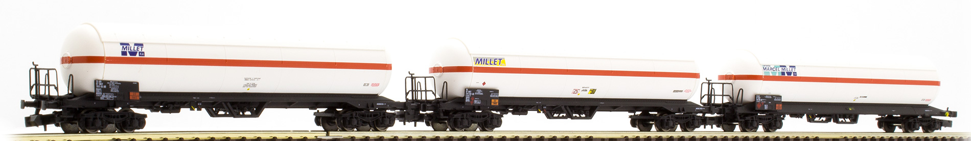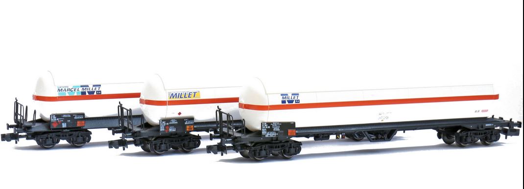 Marquages Marcel Millet sur les trois citernes Présence d'une passerelle serre frein sur les trois wagons Annonce de la sortie à Nuremberg dans Loco Revue N° 800 de mars 2014 |