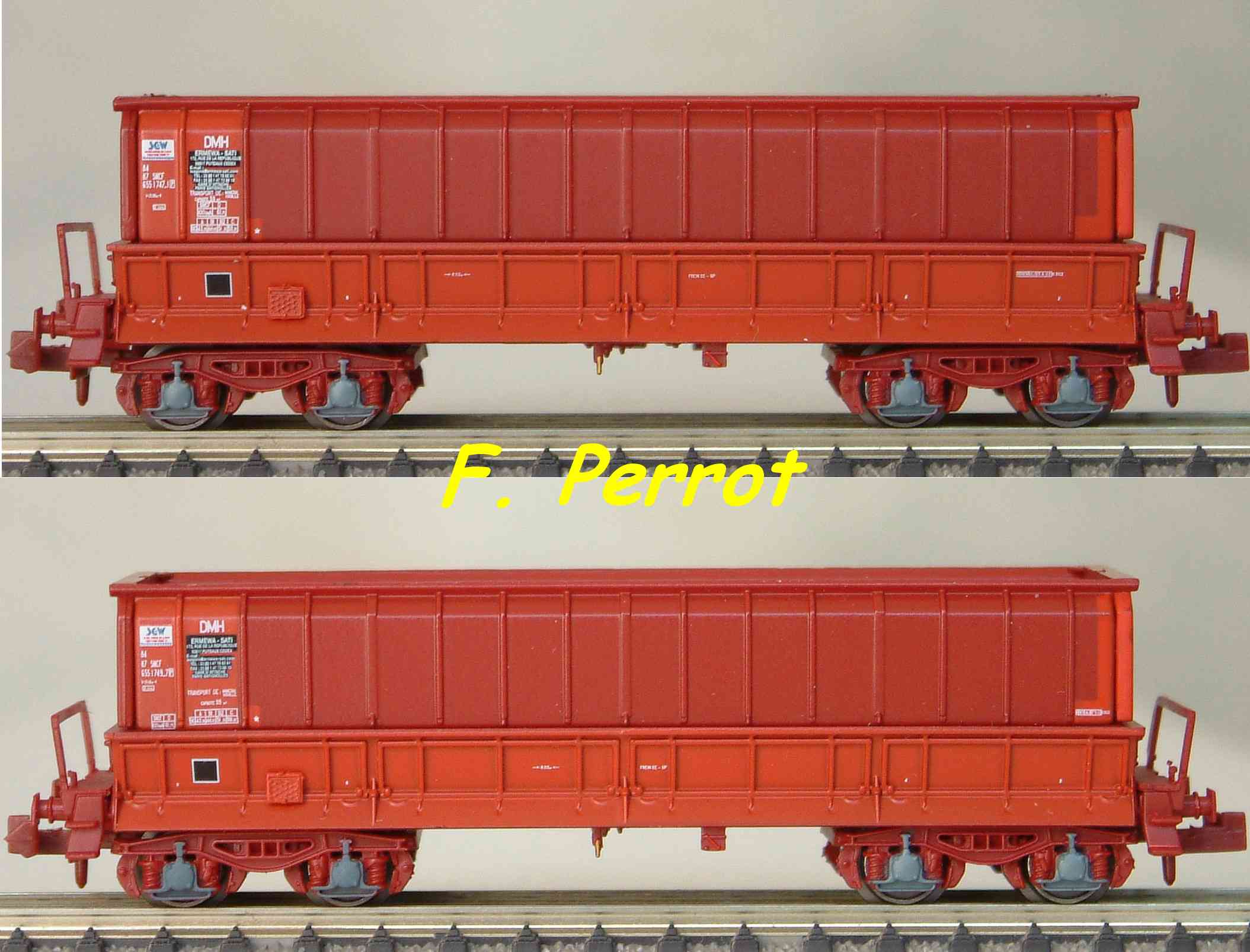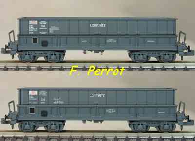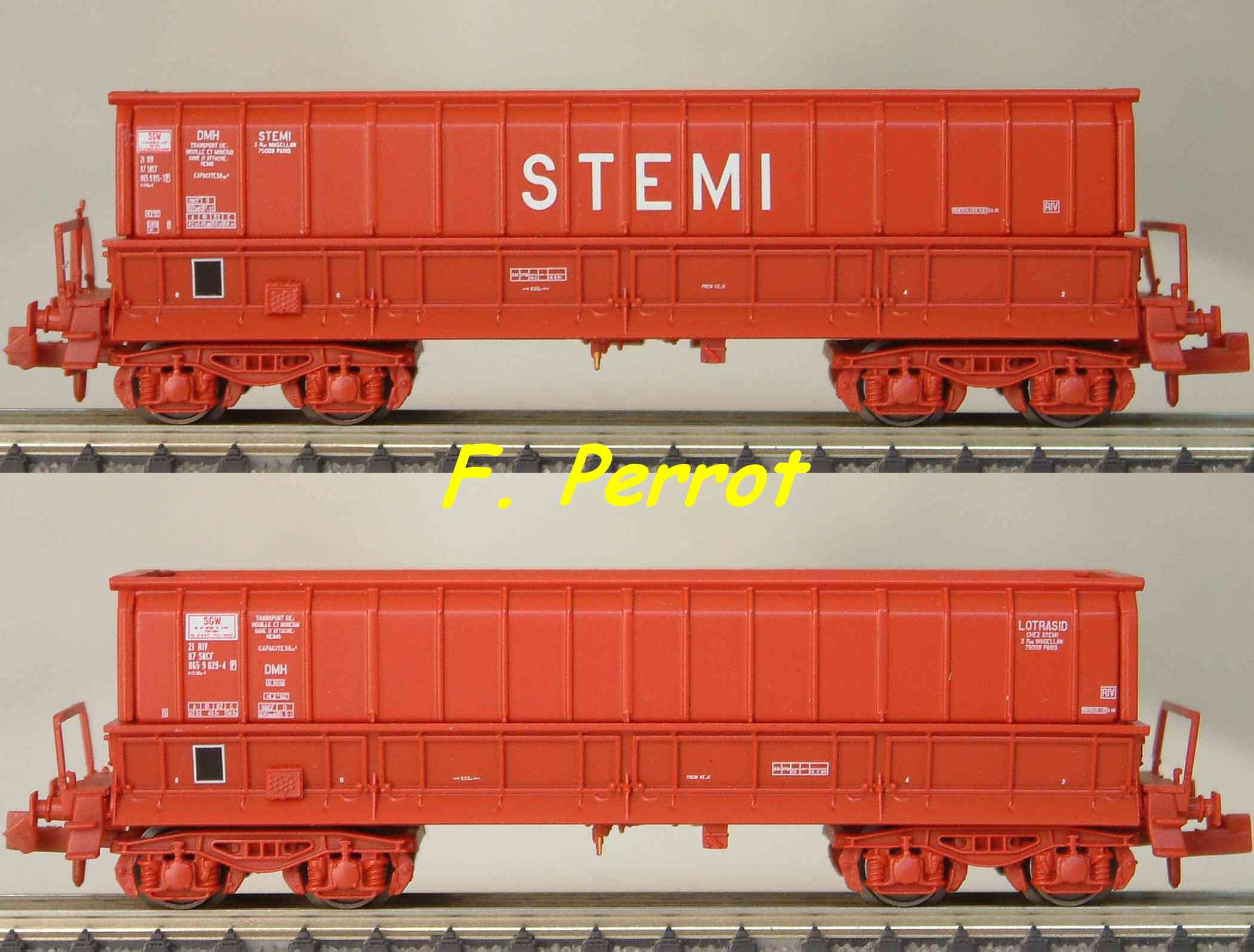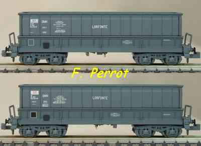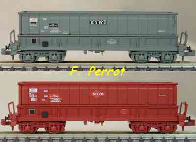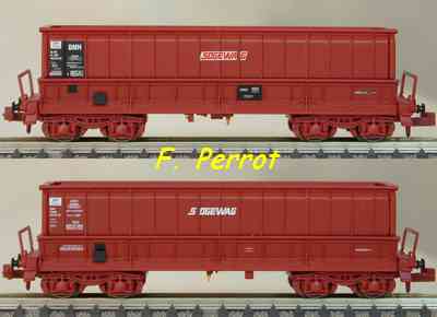 | Description | Coffret de 2 wagons minéraliers type Dmh couleur rouge UIC STEMI et LOTRASID | |