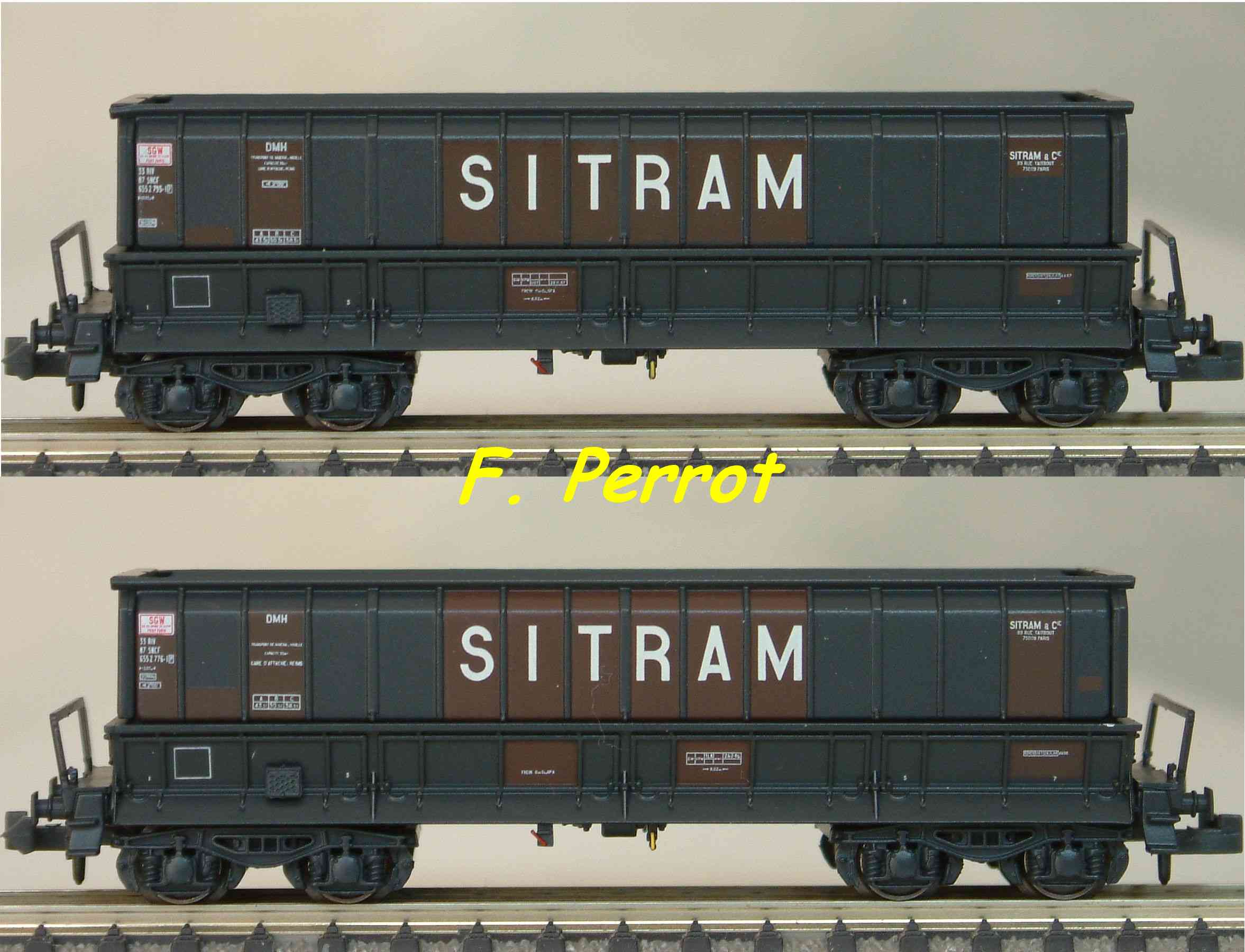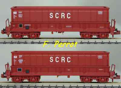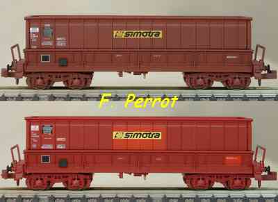 | Description | Coffret de 2 wagons minéraliers type Dmh couleur gris foncé et rouge UIC Sitram | |