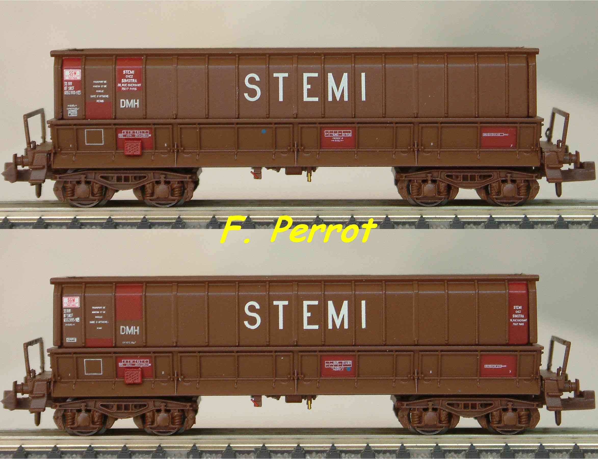 | Description | Coffret de 2 wagons minéraliers type Dmh couleur brun avec marquage STEMI | |