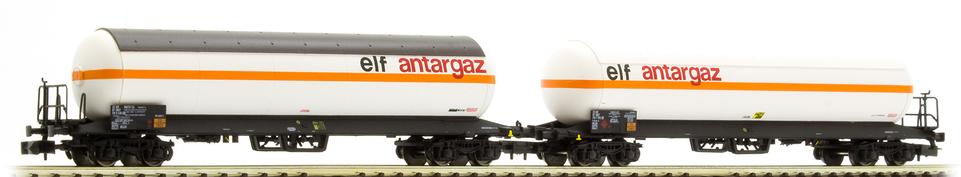 | Description | Coffret de 2 wagons citernes à gaz Us à extrémités sphériques et pare soleil | |