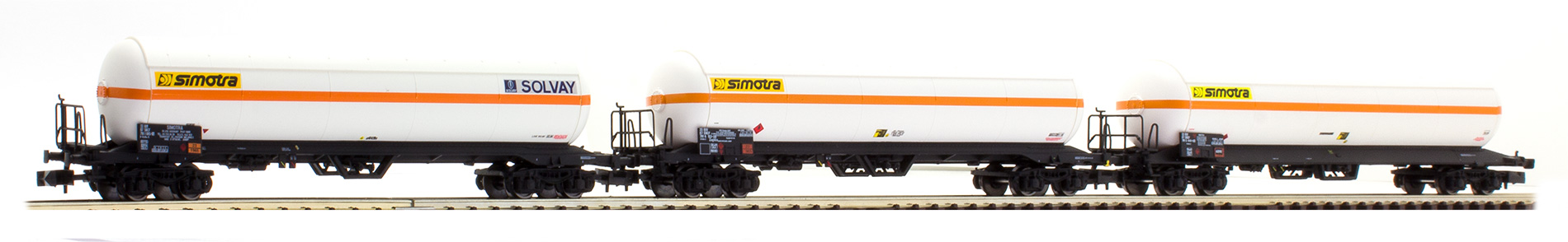 Marquage Simotra sur les trois citernes Présence d'une passerelle serre frein sur les trois wagons Annonce de la sortie à Nuremberg dans Loco Revue N° 800 de mars 2014 |