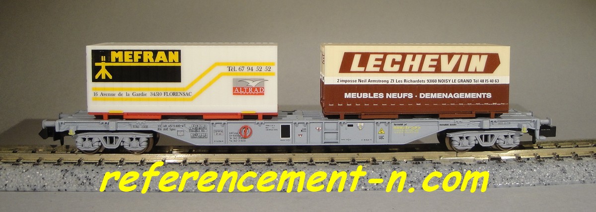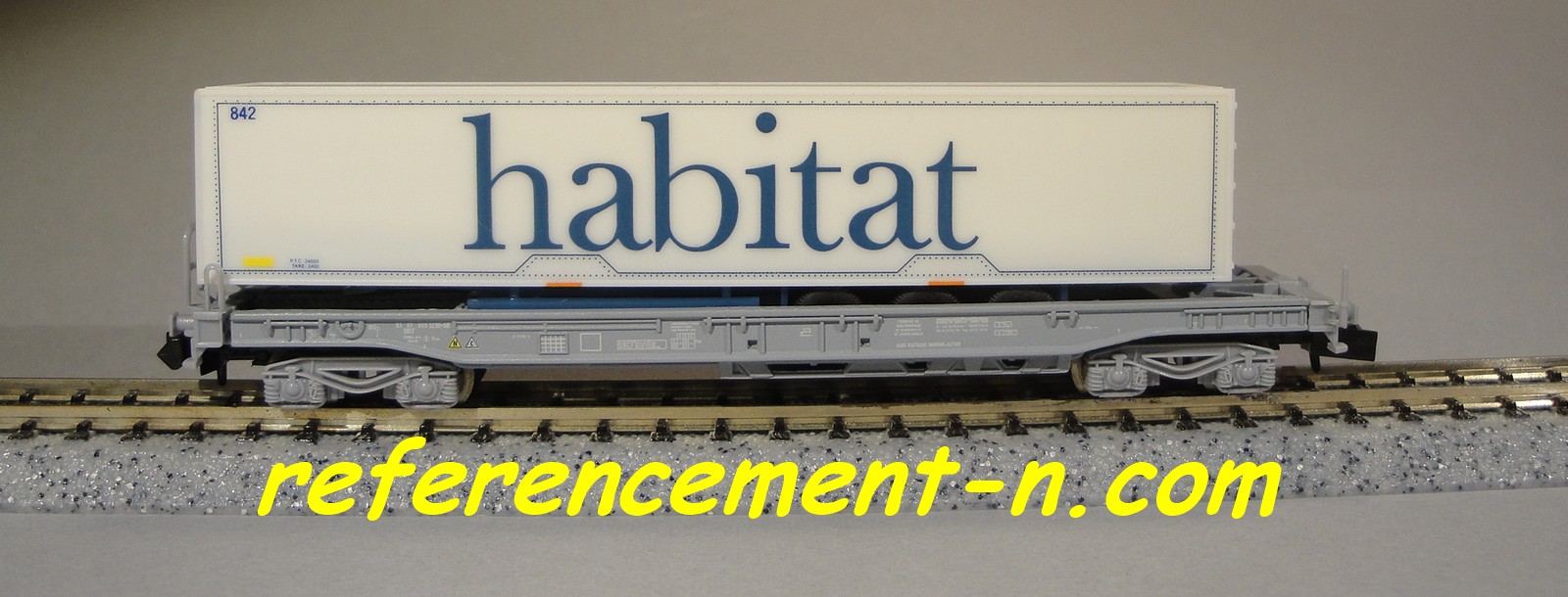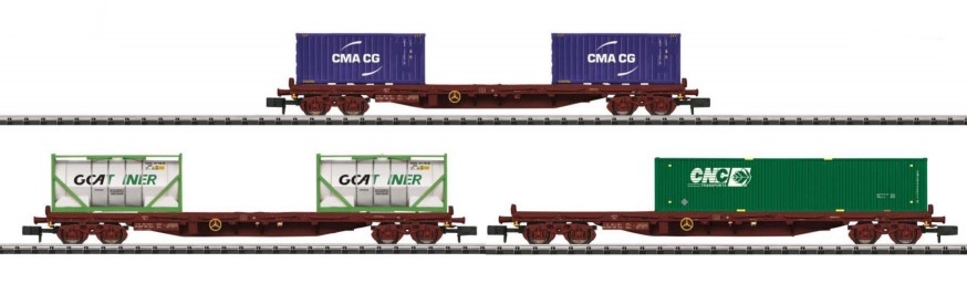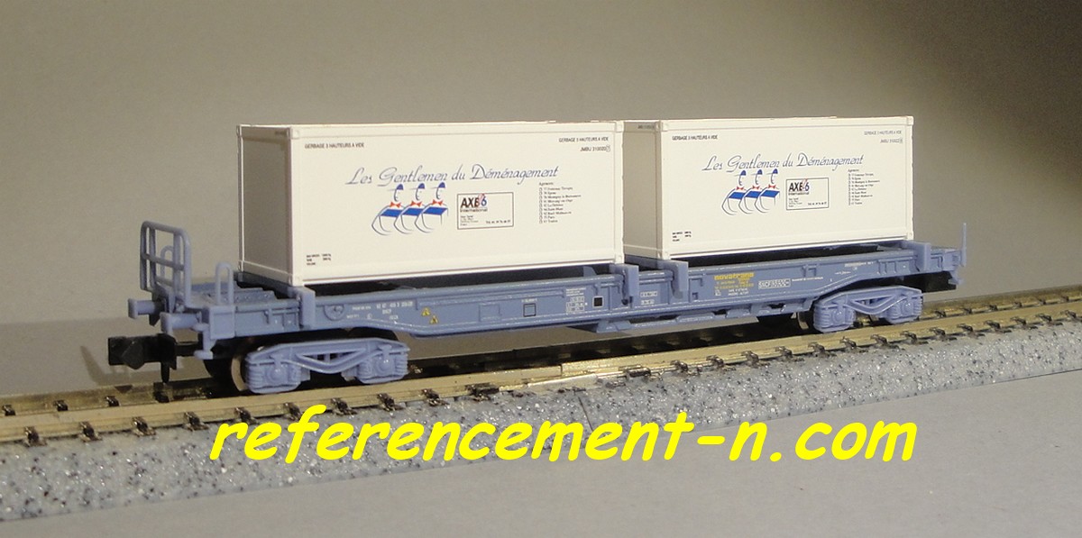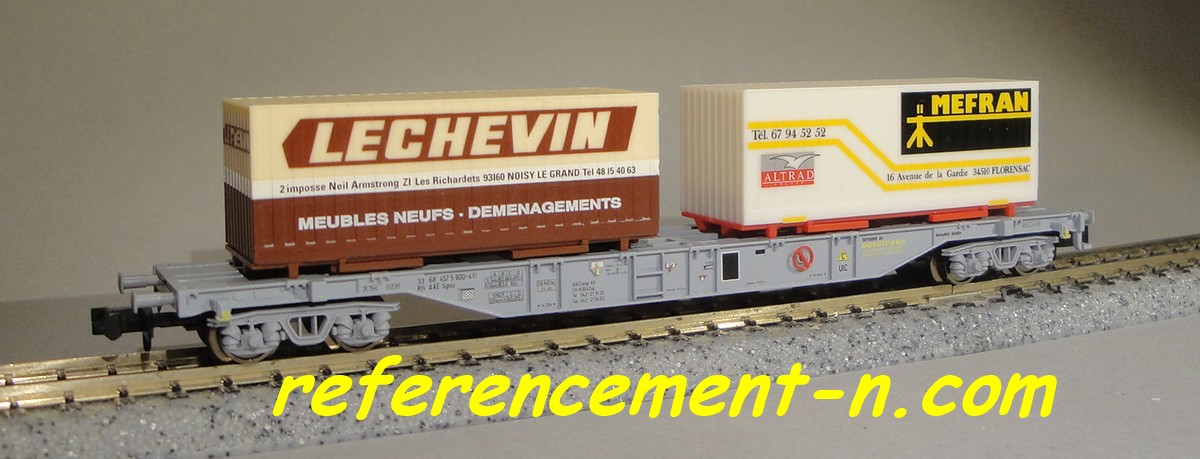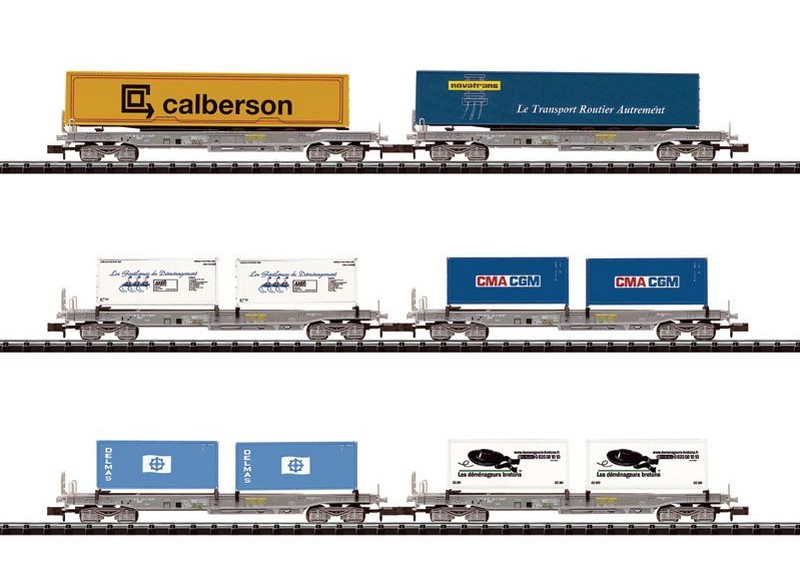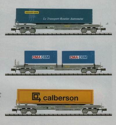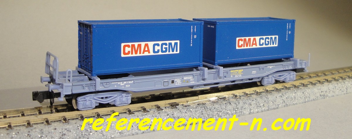 Chargement de contenbeurs 20 et 40 pieds Conteneur 40 pieds vert marquage CNC Conteneurs bleus 20 pieds marquage CMA CG Conteneurs citenrnes gris et verts marquage CGAT INER Bogies Y-25 moulés Ranchers non montés Attelages à élongation Longueur totale de la rame : 372 mm Annonce dans Rail Miniatire Flash N° 647 de mars/avril 2020 Annonce de la sortie dans Loco Revue N° 896 de mars 2022 |