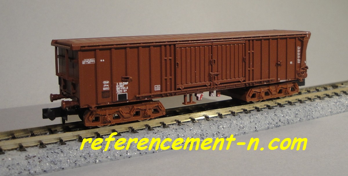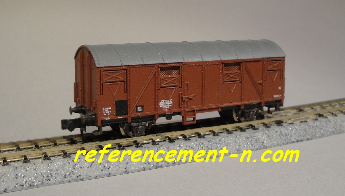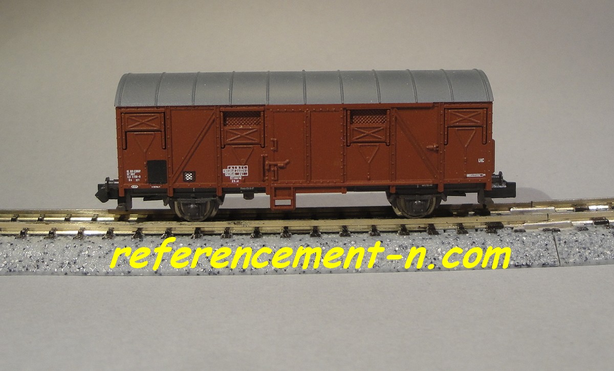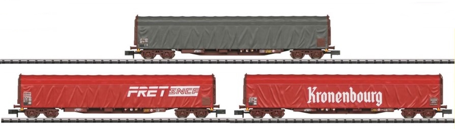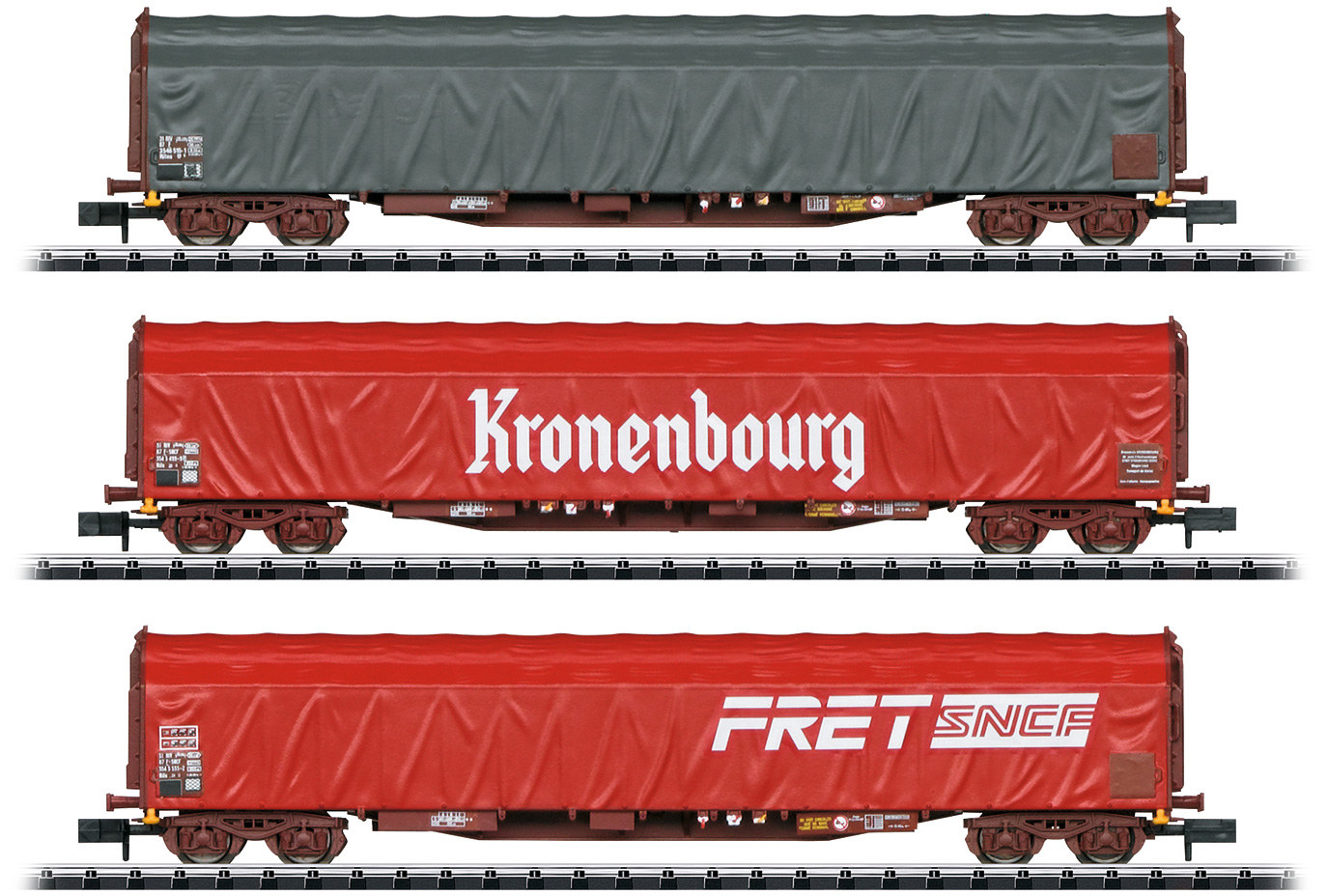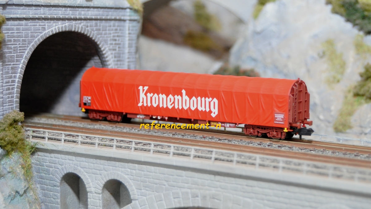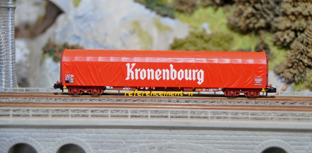 Wagon bache grise sans marquage Wagon bache rouge marquage KRONENBOURG Wagon bache rouche marquage FRET SNCF Feux rouges de fin de convoi sur le wagon baché gris Attelages à élongation Longueur totale de la rame : 372 mm Annonce dans Rail Miniatire Flash N° 647 de mars/avril 2020 Annonce de la sortie dans Loco Revue N° 890 de septembre 2021 |