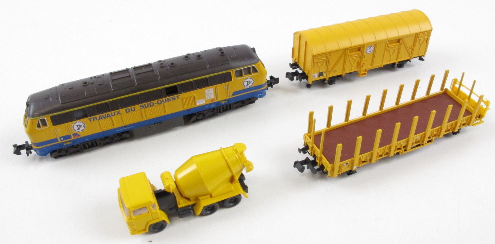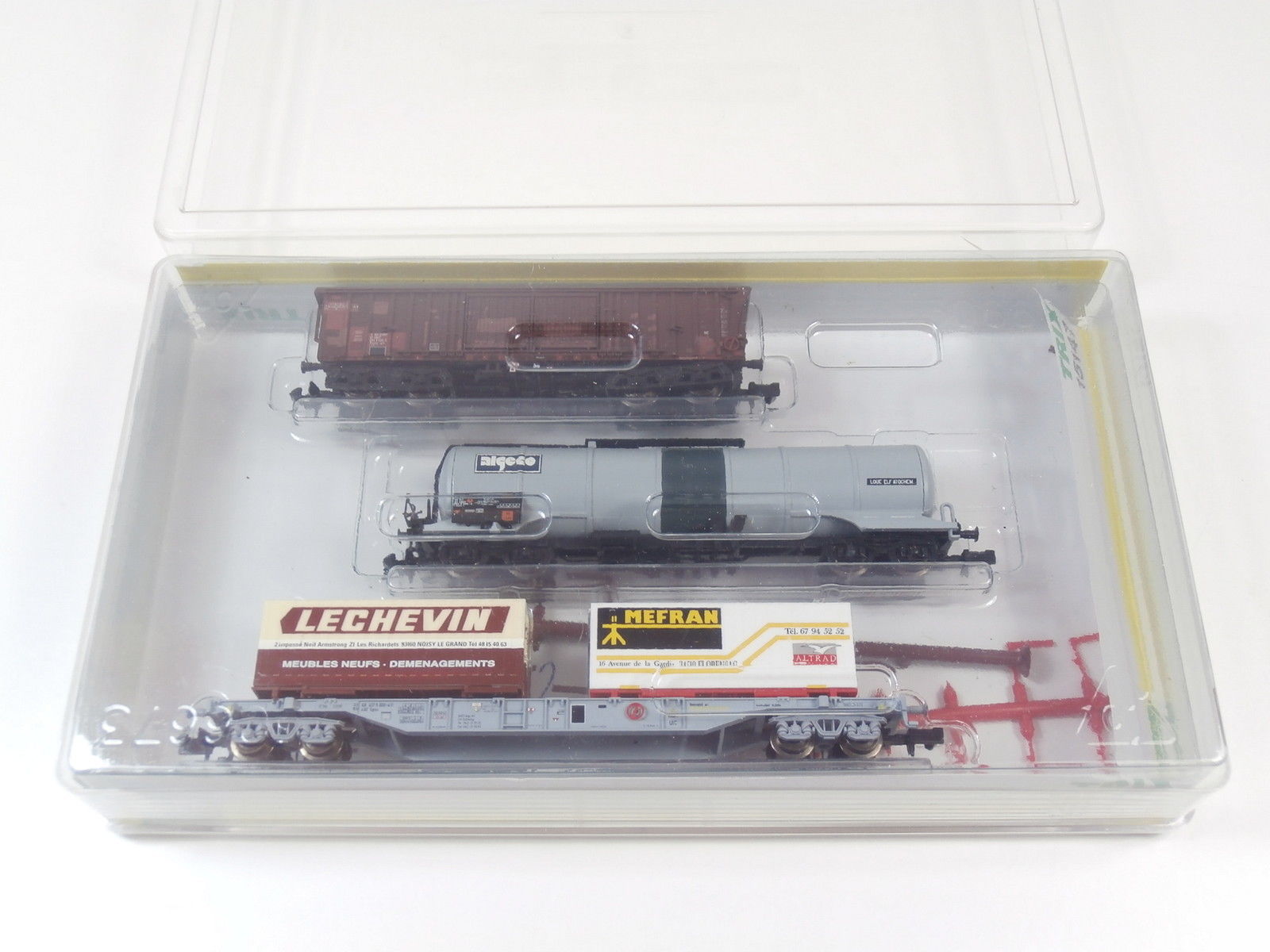 | Description | 3 wagons boggies 1 tombereau, 1 citerne ALGECO, 1 plat chargé 2 conteneurs | |