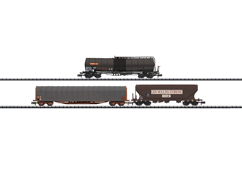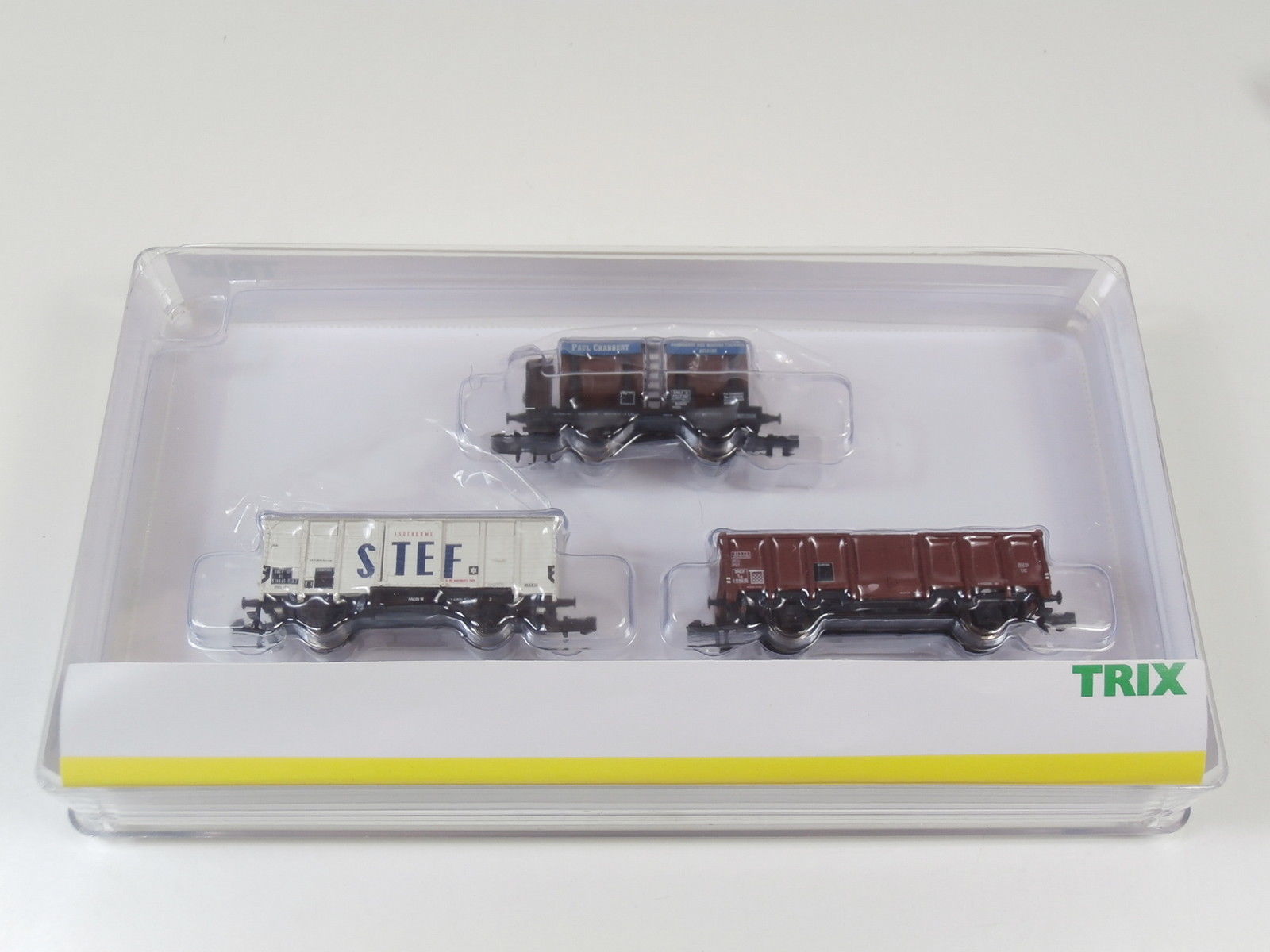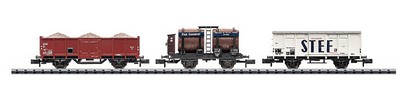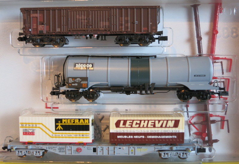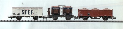 | Description | Coffret de 3 wagons : un wagon foudre brun, un wagon réfrigéré blanc et un wagon tombereau brun | |