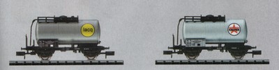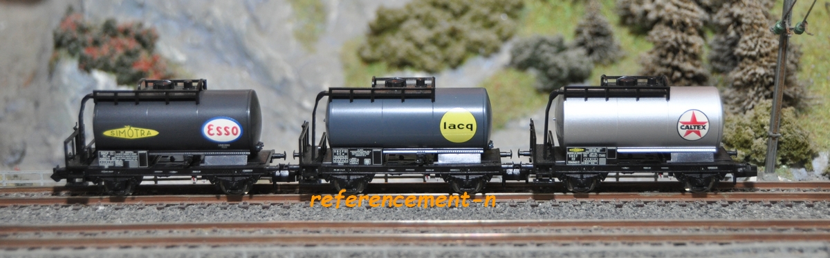 | Description | 3 wagons citernes privés 2 essieux gris marquages ESSO CALTEX LACQ | |