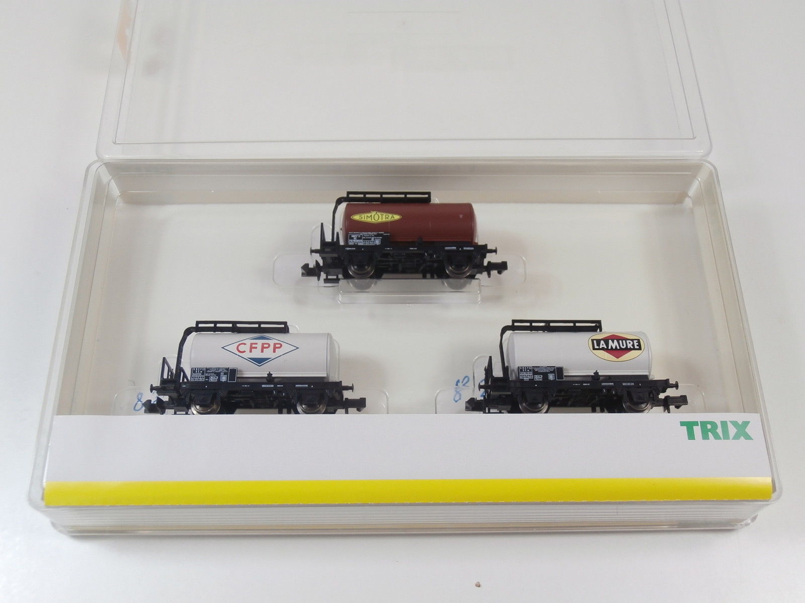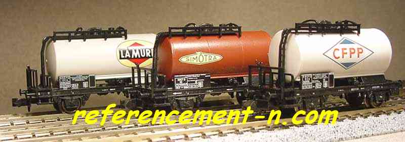 | Description | 3 wagons citernes privés 2 essieux gris bruns marquages LA MURE CFPP SIMOTRA | |
