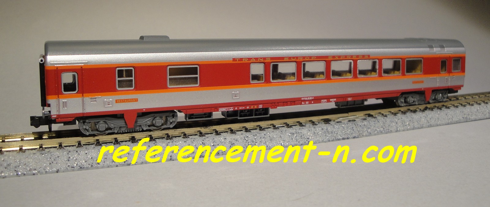 rouge avec bandes blanches pour la voiture restaurant Logo jaune encadré Eclairage intérieur par leds en option (Réf. 66616) Attelages à élongation Longueur totale de la rame : 459 mm Annonce dans le catalogue nouveautés 2022 Annonce dans Loco Revue N° 896 de mars 2022 Annonce de la sortie dans Loco Revue N° 898 de mai 2022 |